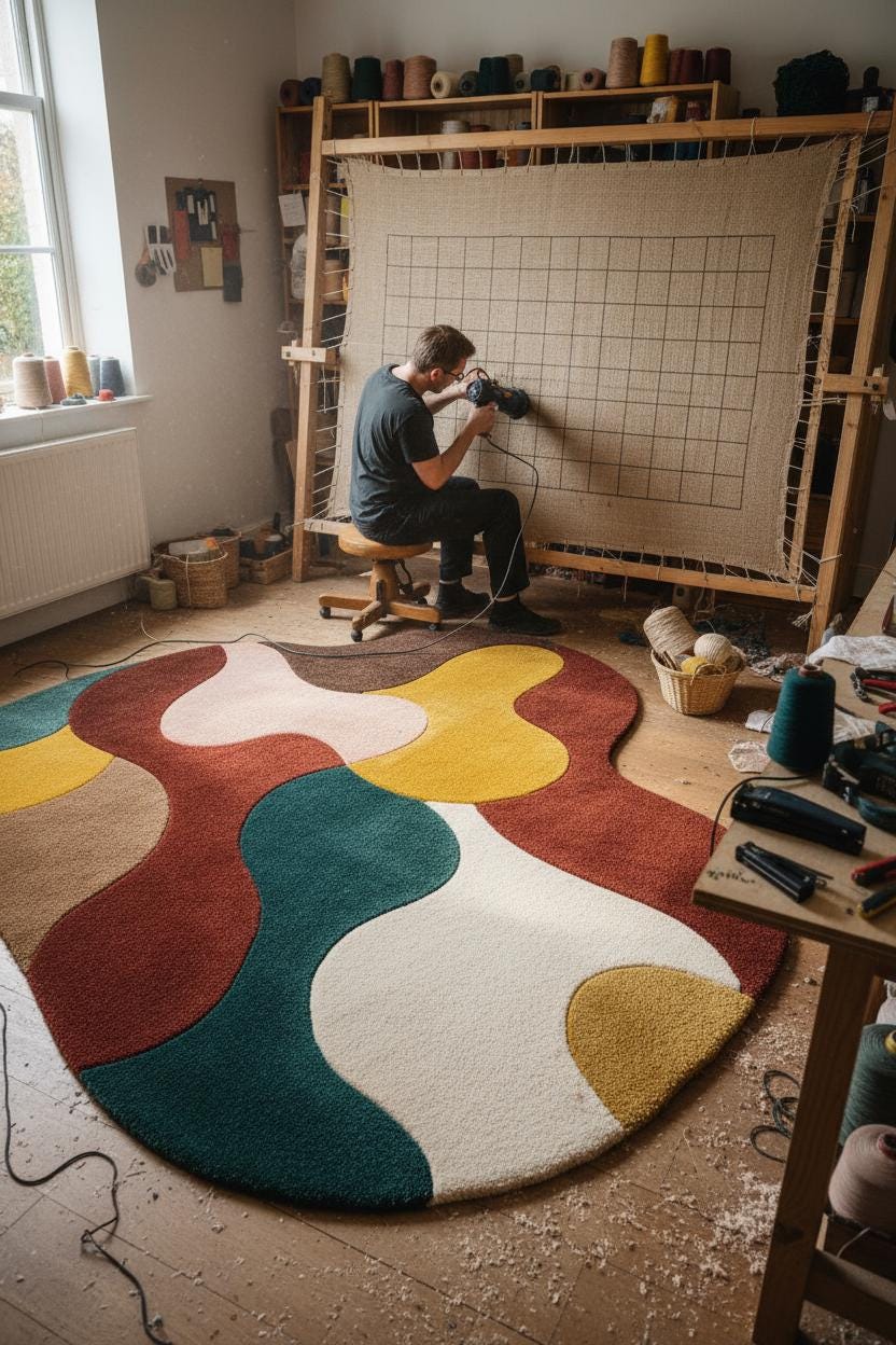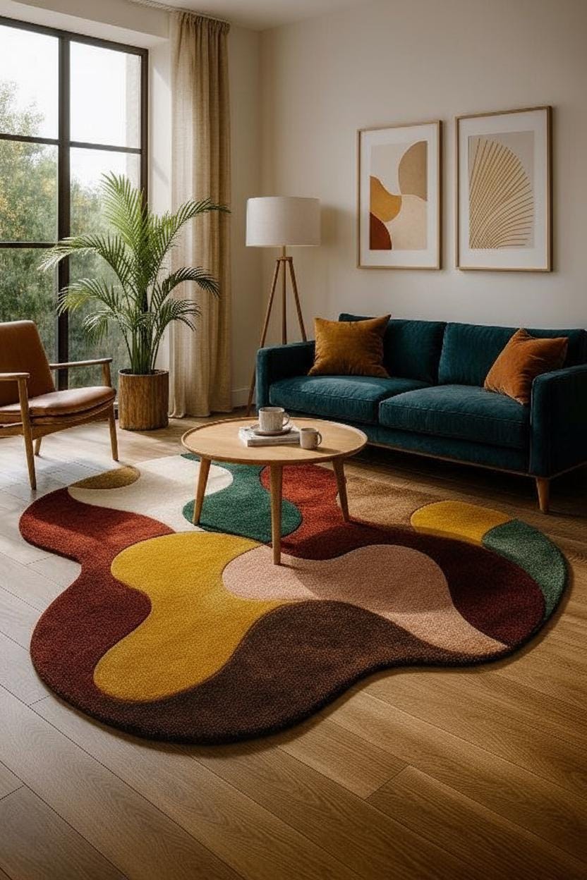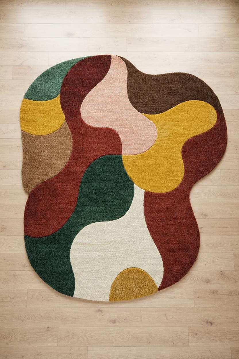 Elevate your home with this hand-tufted wool rug, featuring a stunning organic abstract shape and a rich palette of earthy warm tones. Flowing curves in mustard yellow, terracotta red, forest green, cream, and chocolate brown create a vibrant yet natural look that instantly transforms any room into a cozy, artistic haven.