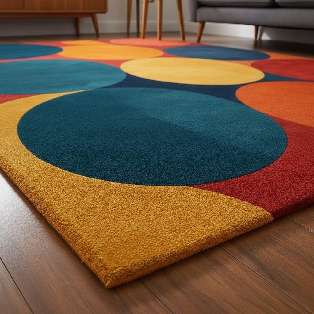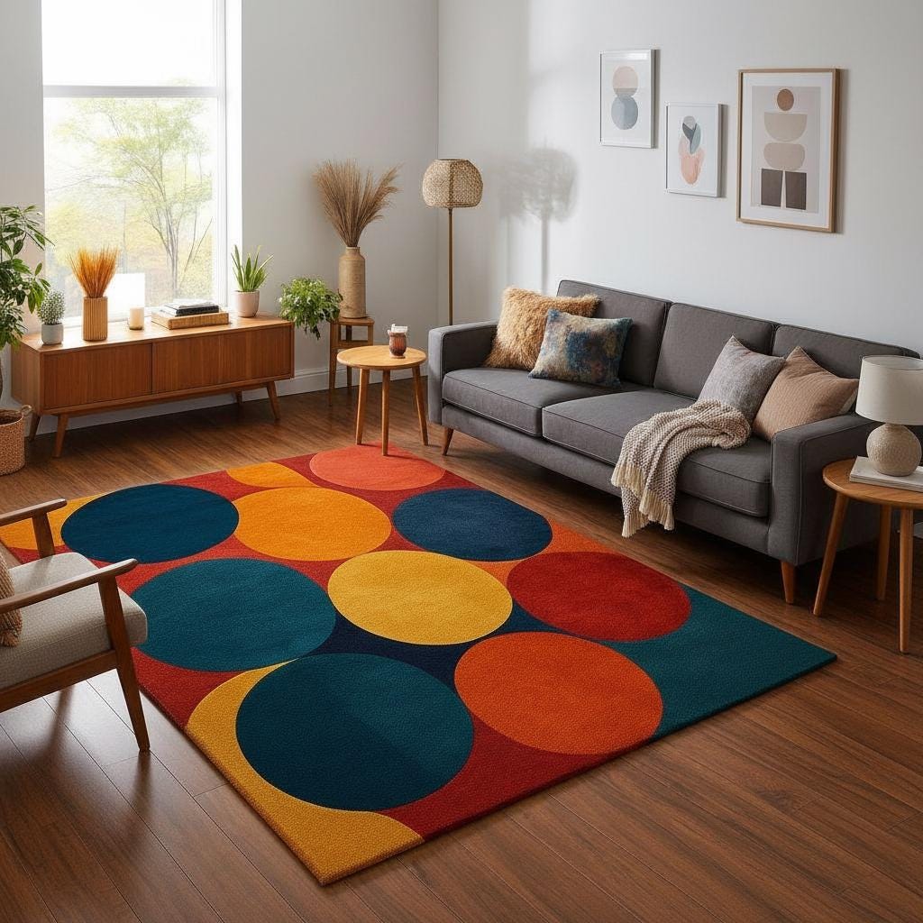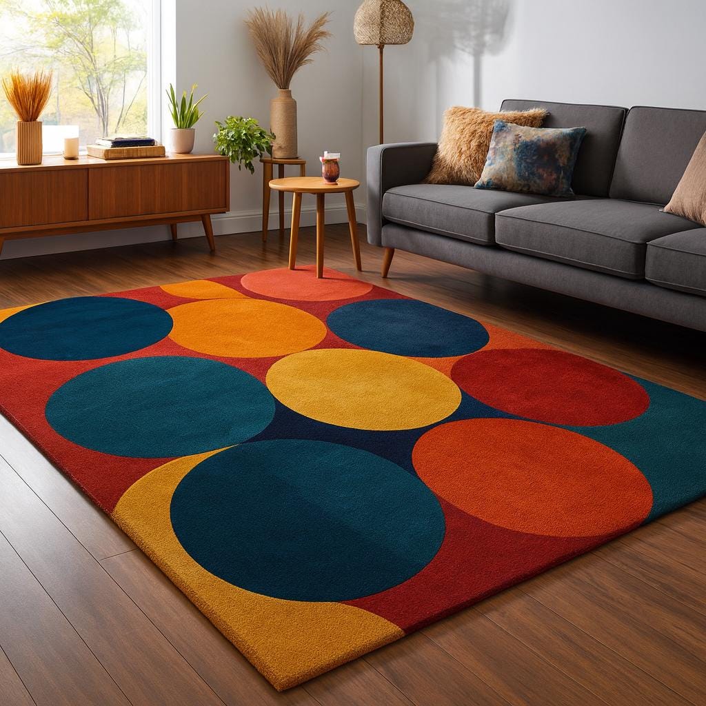 Bring bold personality and artistic charm to your space with this stunning hand-tufted geometric rug featuring large overlapping circles in rich, modern colors. Designed for those who love retro flair, mid-century style, and eye-catching decor, this rug instantly becomes the centerpiece of any room.
