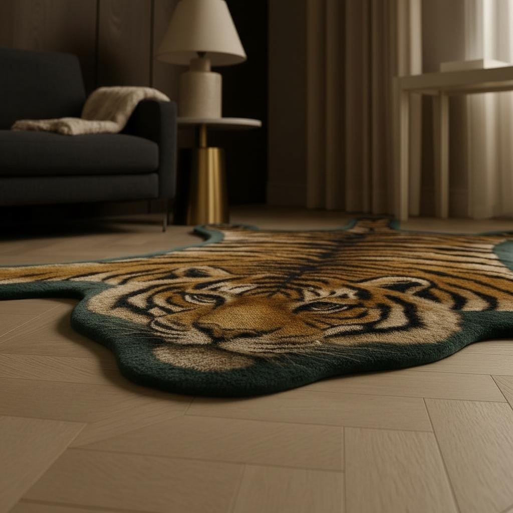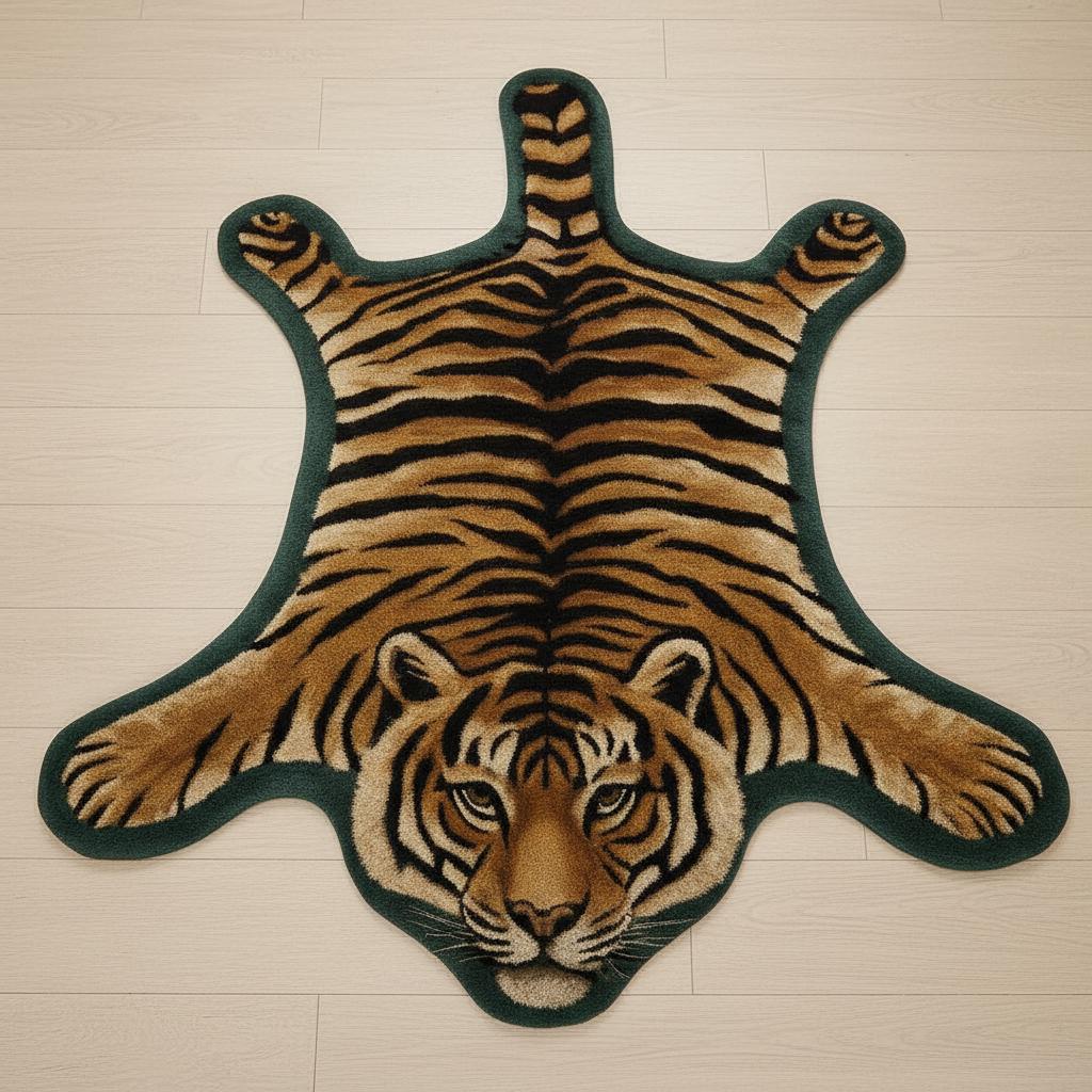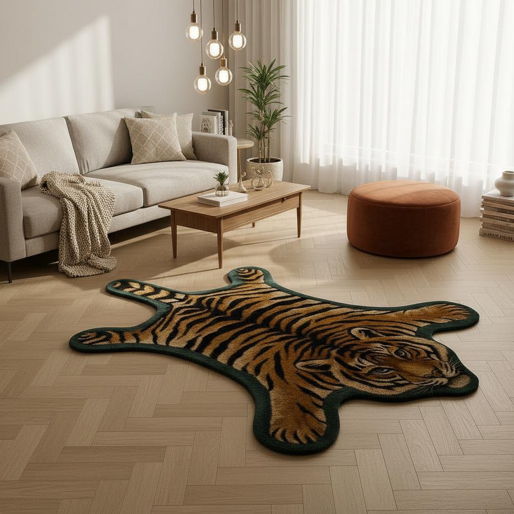Transform your home with this hand-tufted tiger-shaped wool rug, a striking blend of craftsmanship, artistry, and modern interior style.