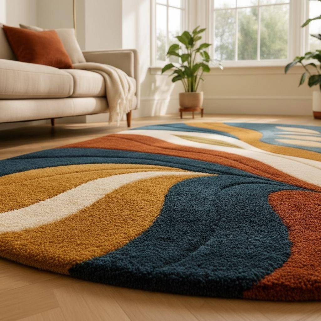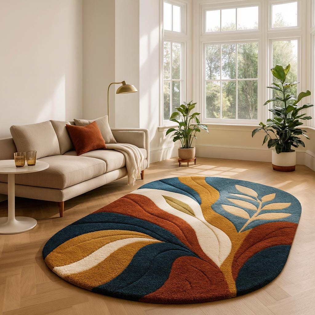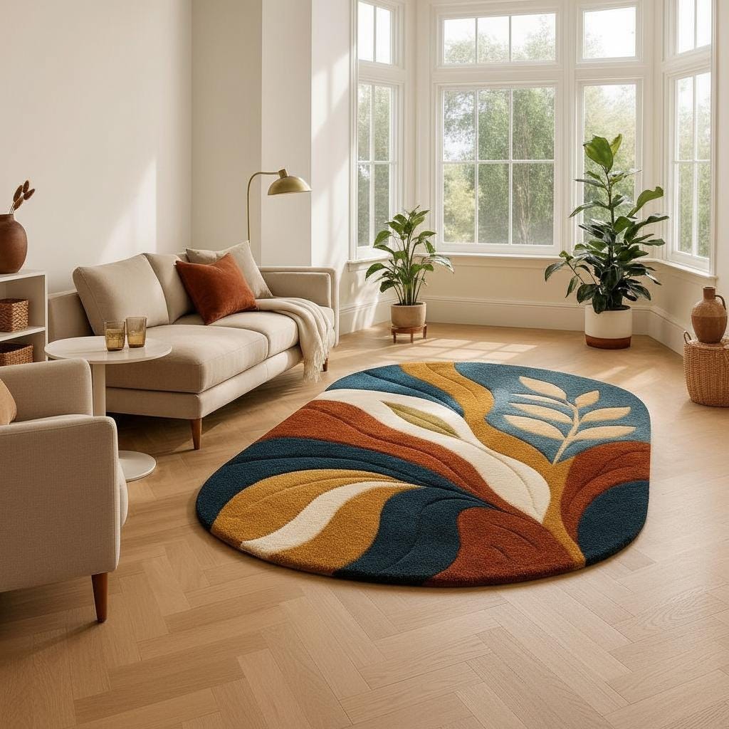 Bring warm elegance and bold modern artistry into your home with this hand-tufted abstract organic rug, featuring a flowing blend of navy blue, burnt rust, mustard gold, creamy ivory, and soft olive green. The smooth curves and leaf-inspired motifs create a calming yet vibrant composition, perfect for contemporary, mid-century, boho, and minimalist interiors.
