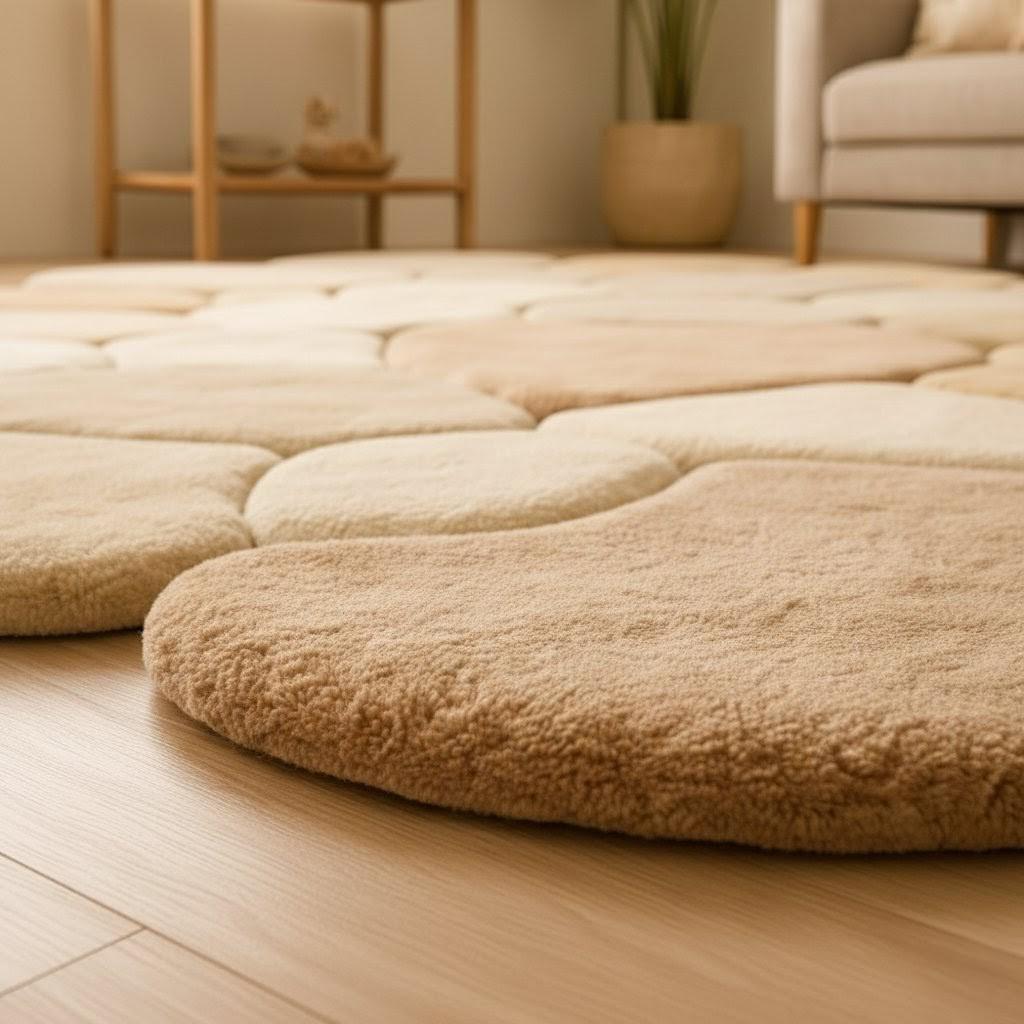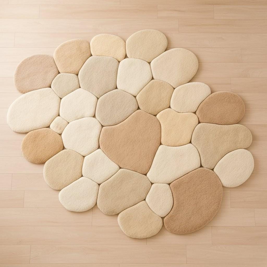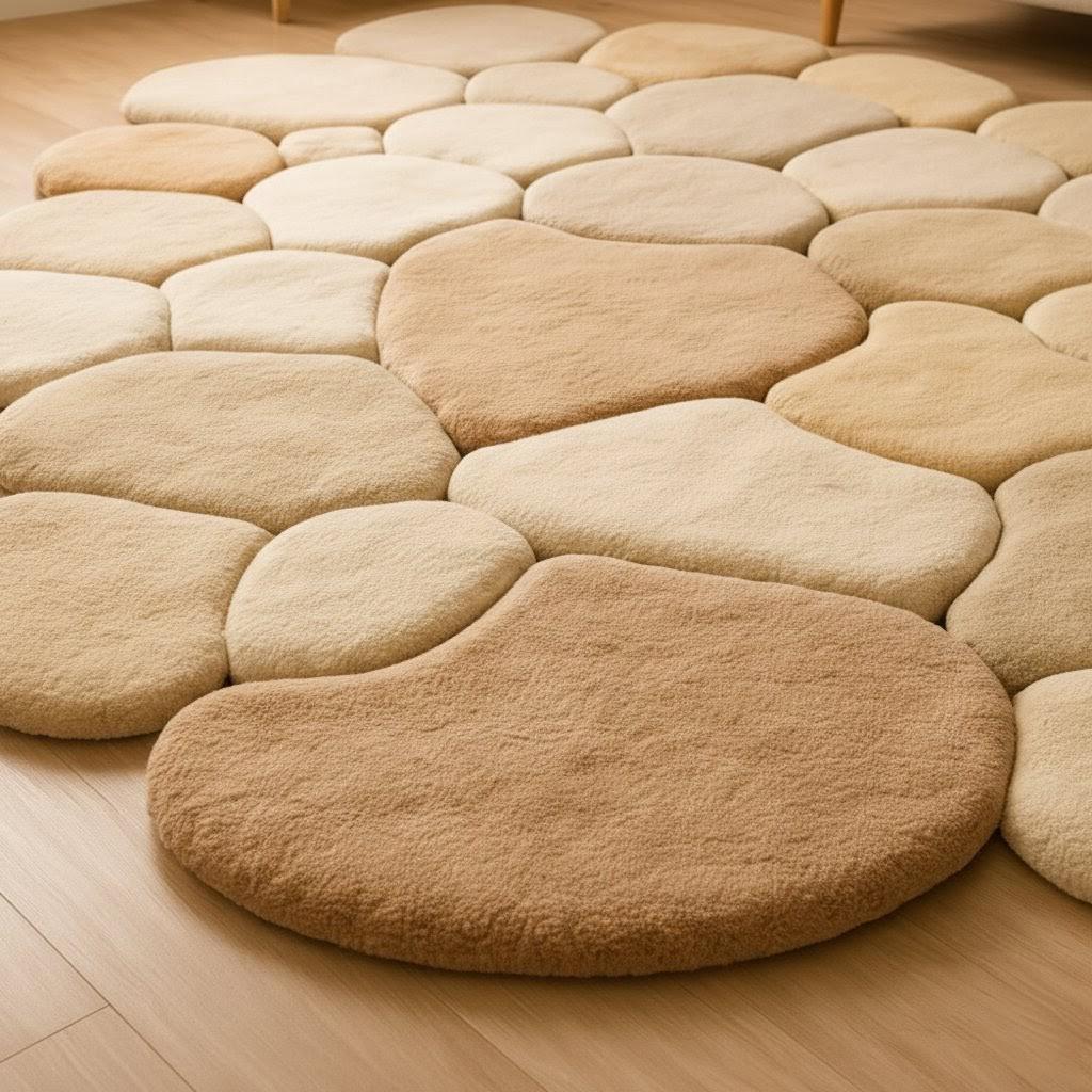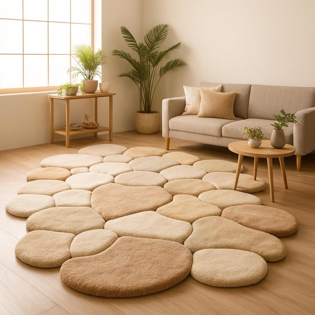Bring natural harmony and modern artistic warmth into your home with this hand-tufted pebble stone rug, inspired by smooth river stones in soft beige, sand, cream, and warm taupe tones. Each pebble-like shape is individually sculpted to create a beautifully layered, textured surface that feels both calming and visually striking.