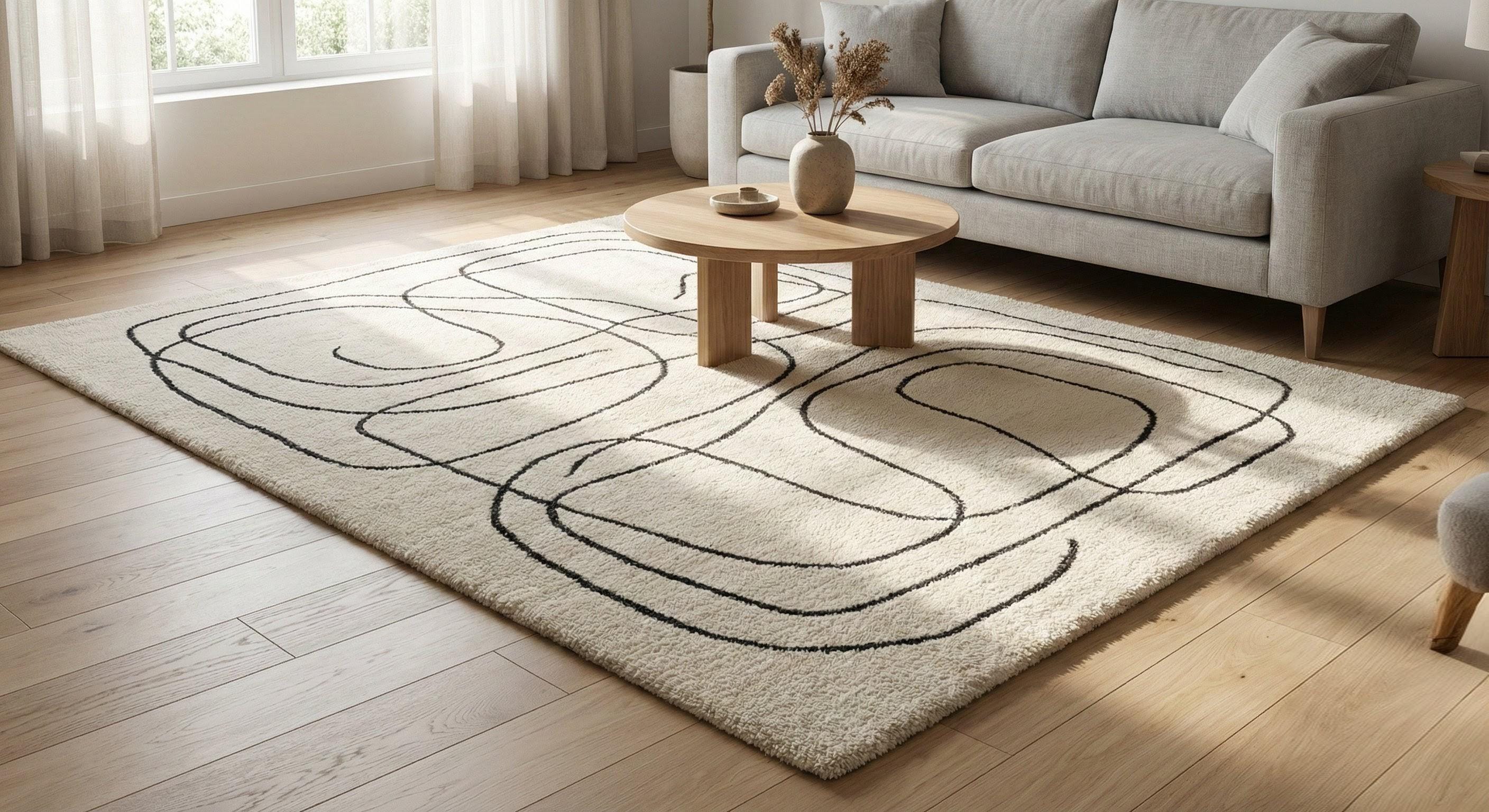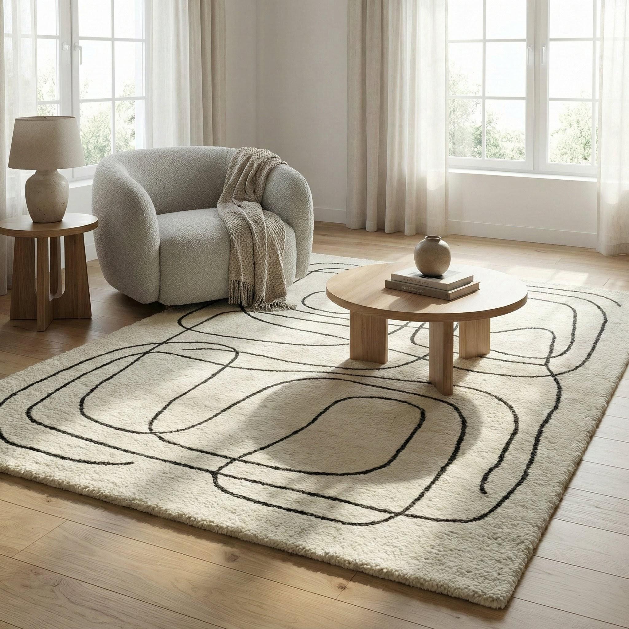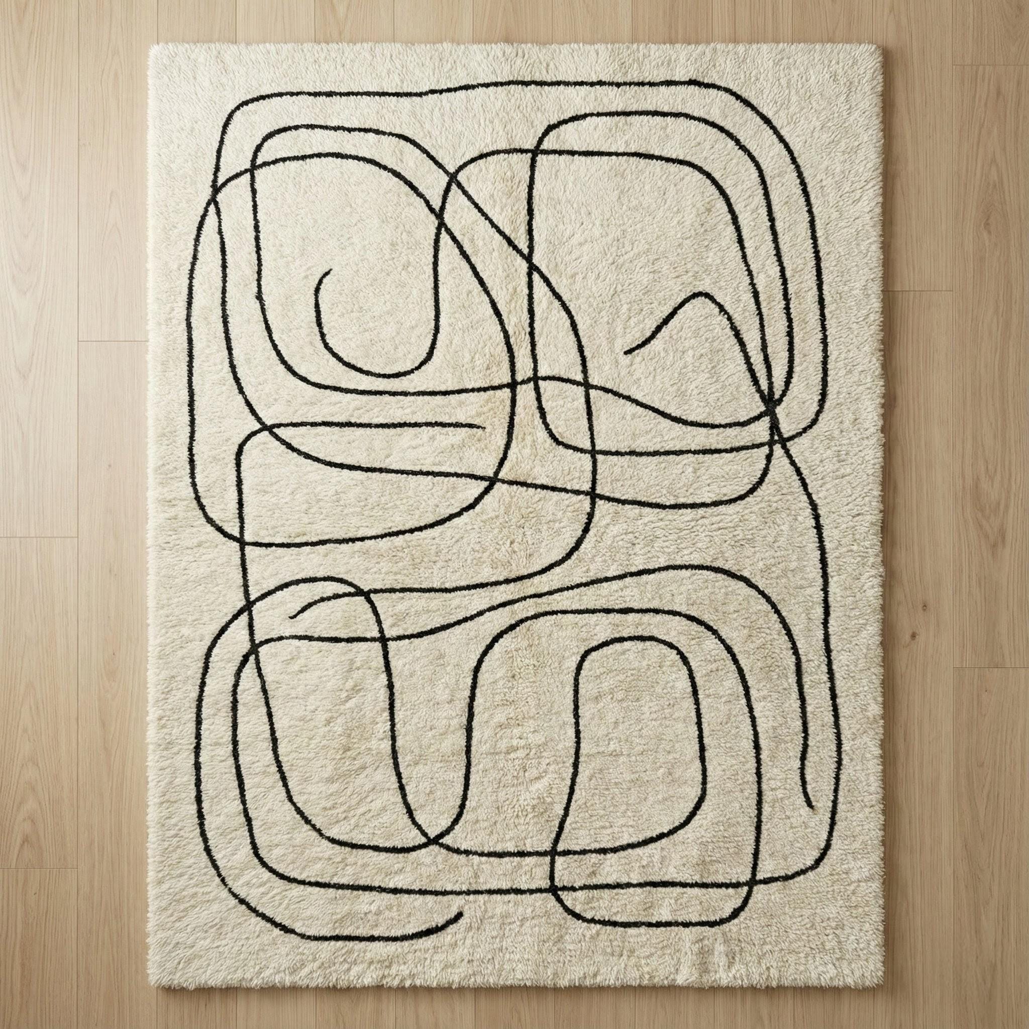 Featuring a clean abstract line art pattern in soft cream and black tones, this rug adds subtle movement and artistic flow without overwhelming your space. The minimalist lines create a modern, gallery-inspired look that feels calm, elegant, and timeless.