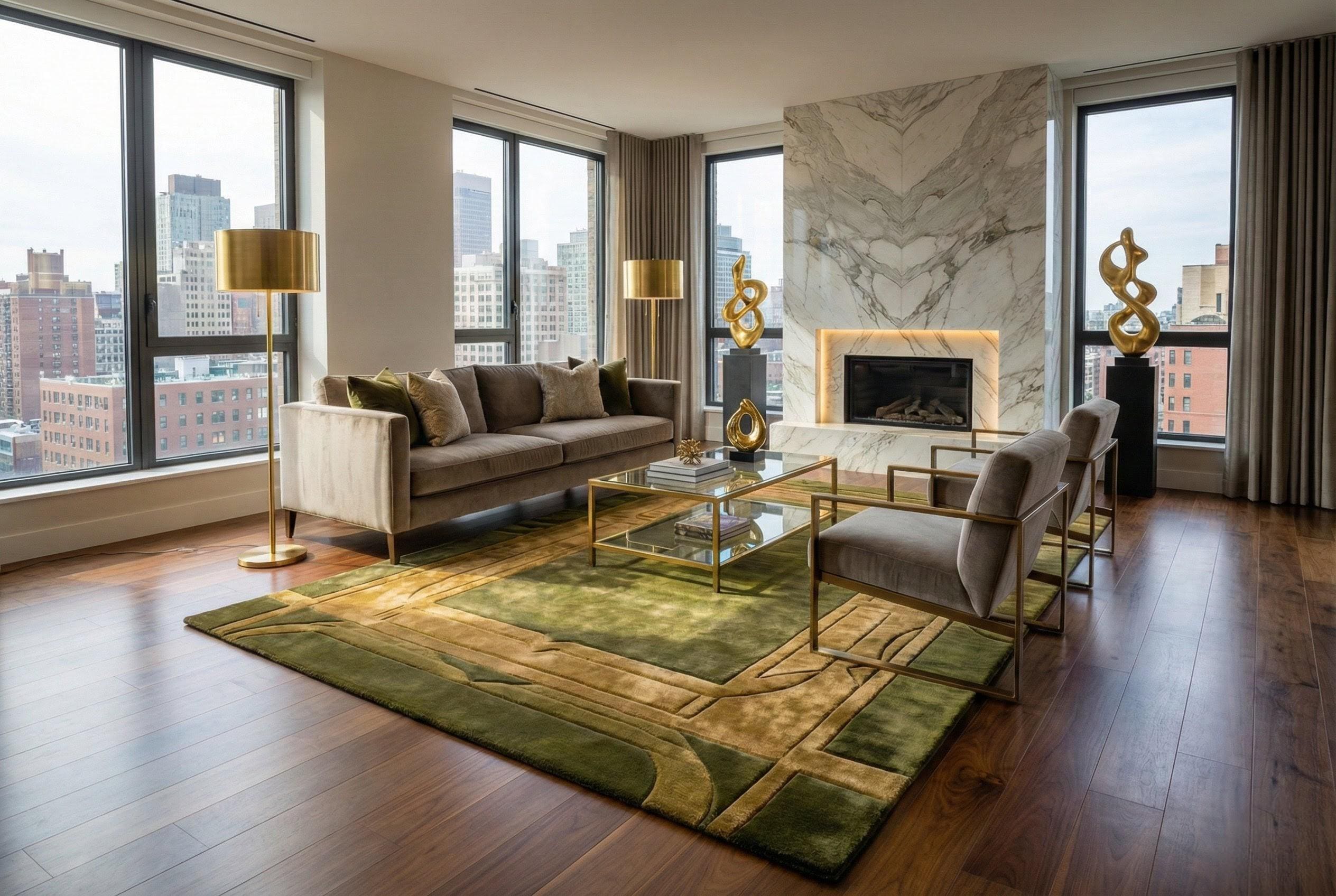 Whether placed under a sofa set, coffee table, or as a centerpiece in a modern living area, this rug blends seamlessly with wooden flooring, neutral furniture, brass accents, and soft ambient lighting.