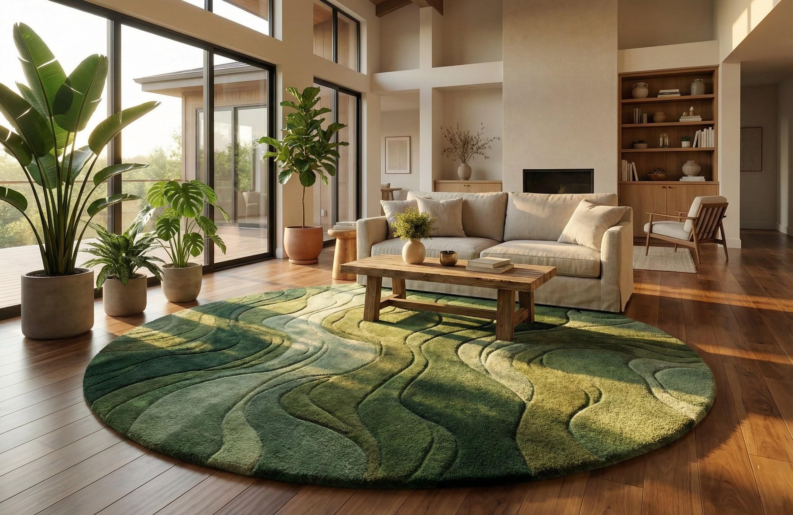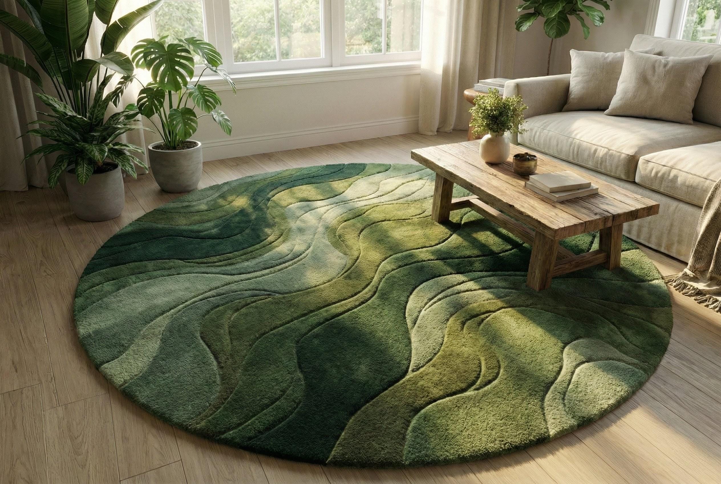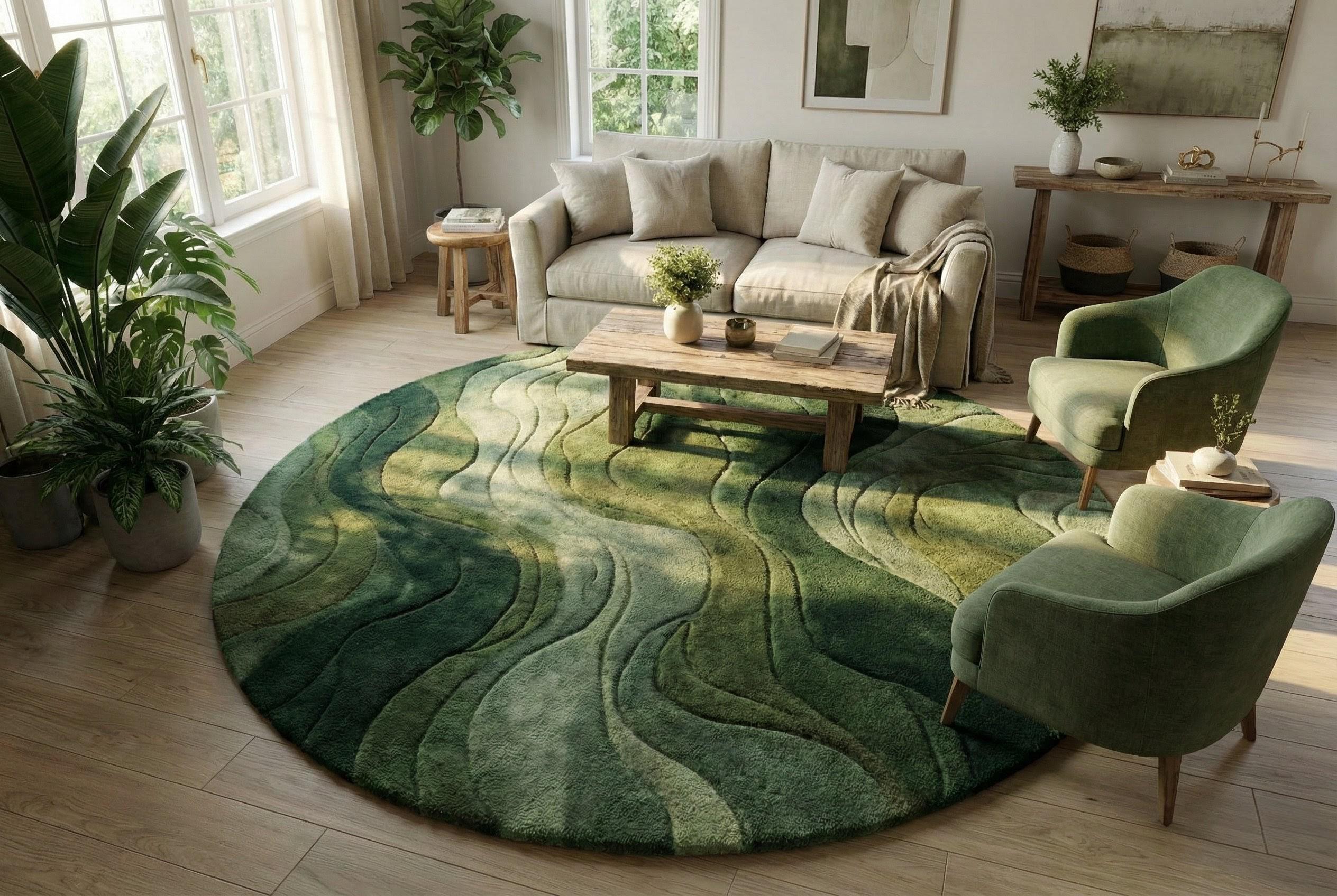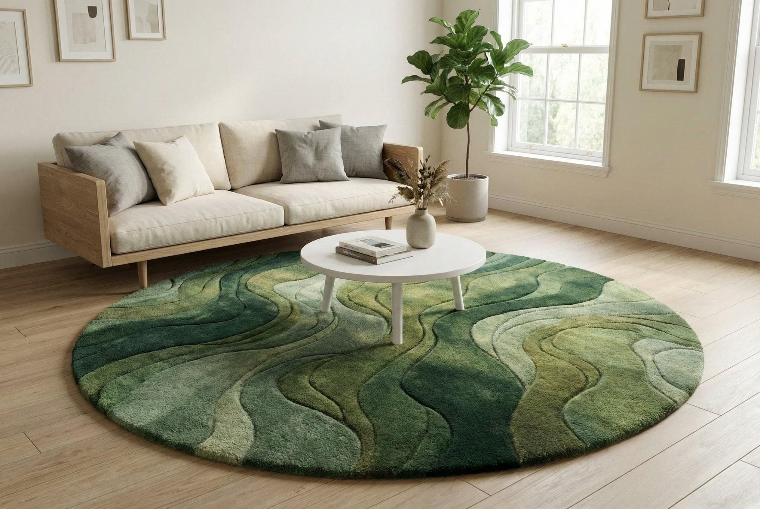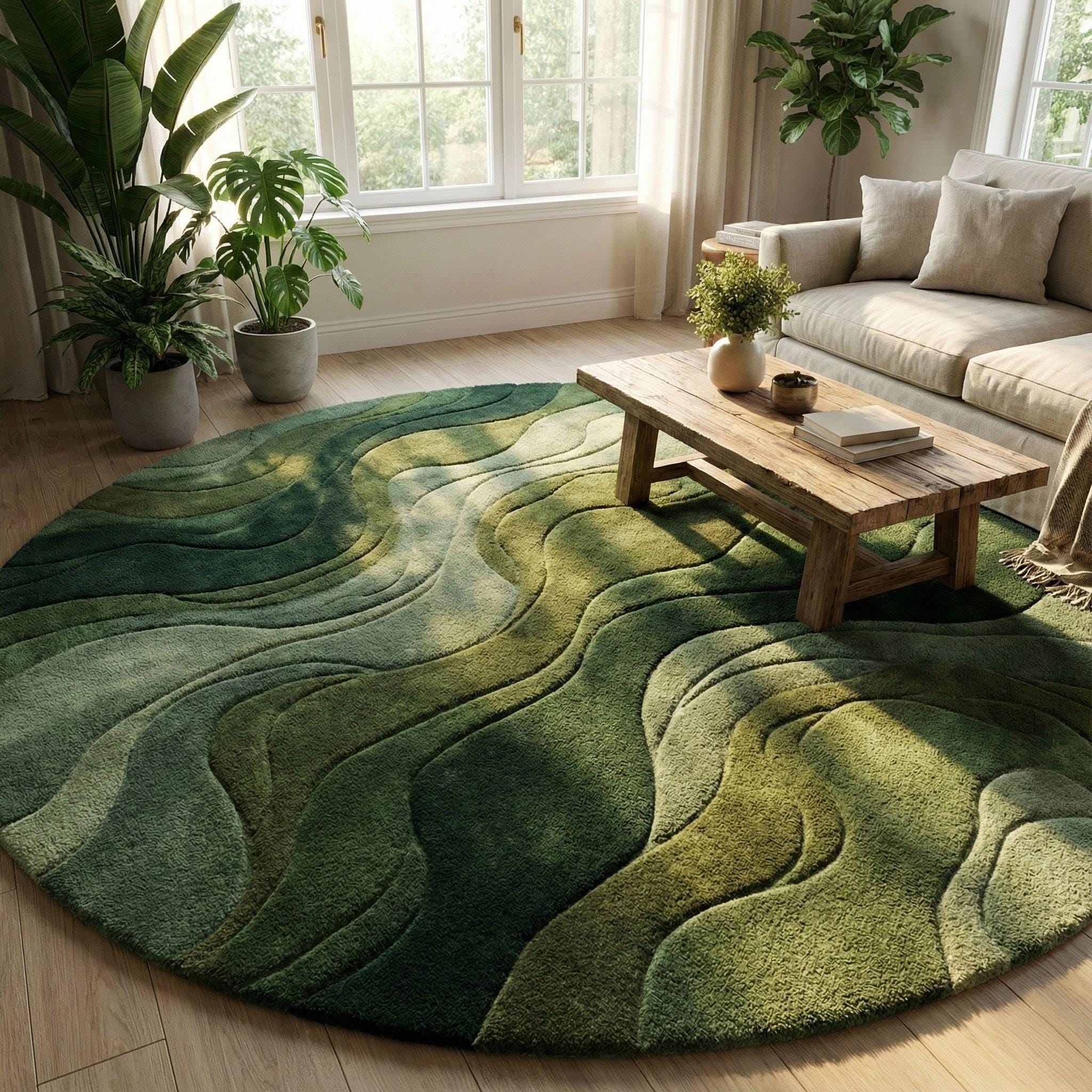✔ green wave rug ✔ organic abstract area rug ✔ hand tufted wool carpet ✔ modern minimalist rug ✔ sculpted texture rug ✔ japandi living room rug ✔ nature inspired green rug