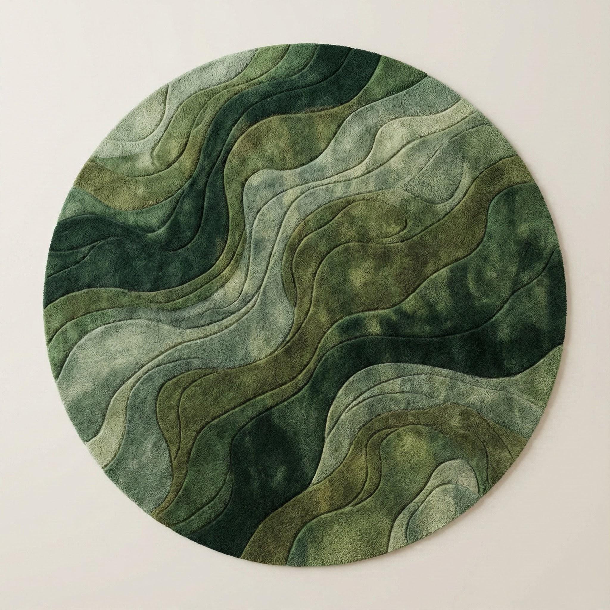 The layered wave pattern in rich shades of forest green, moss, olive, and sage creates a soothing, earthy movement—perfect for serene, modern, and design-forward interiors.