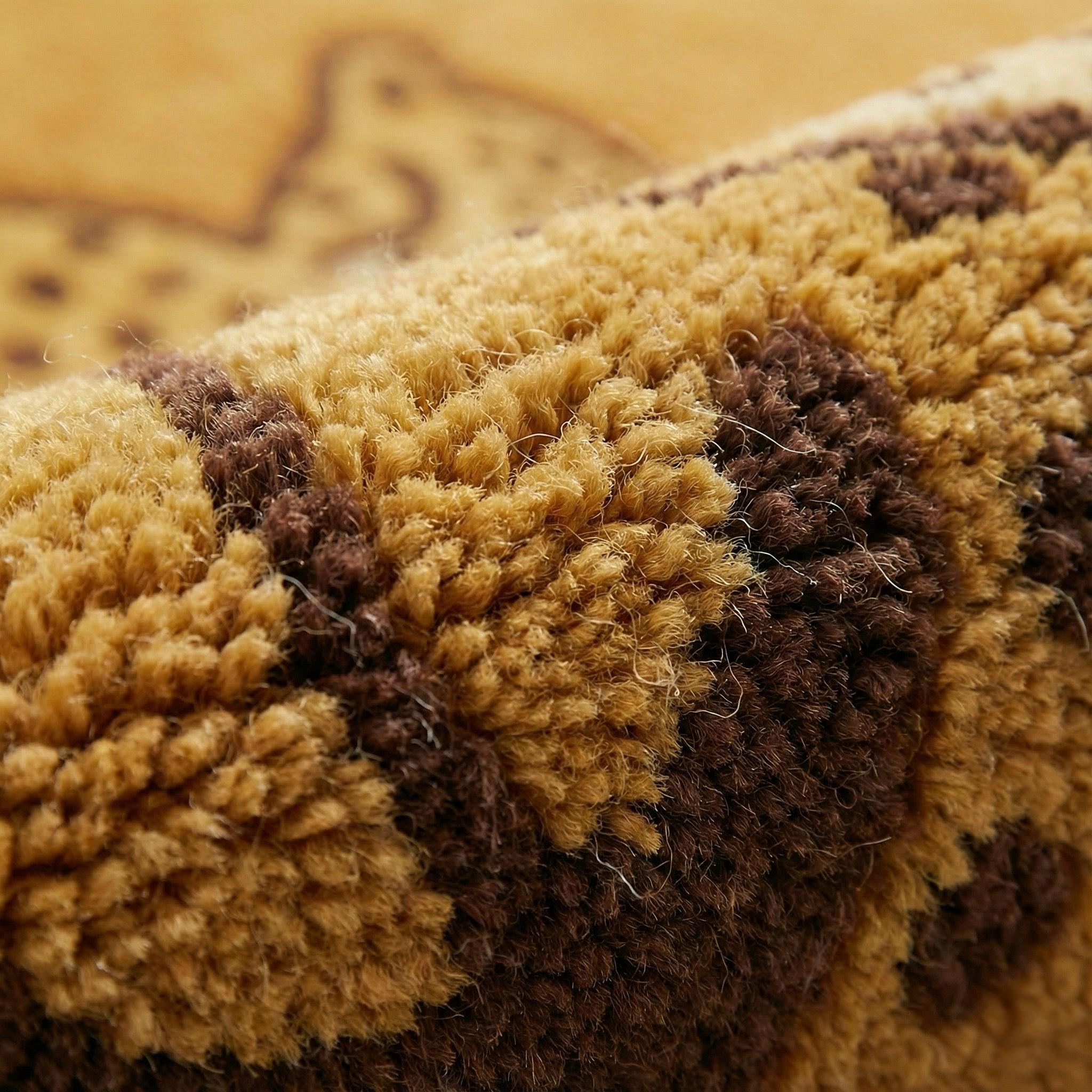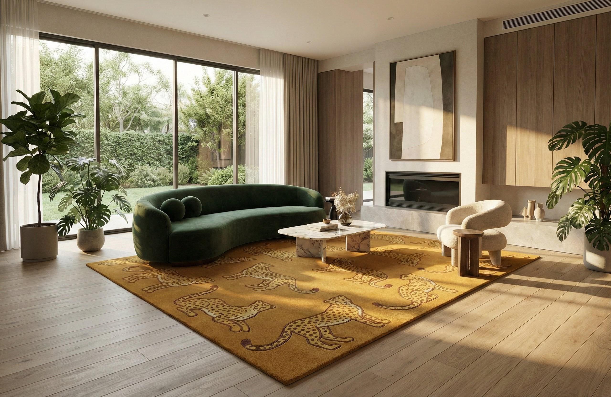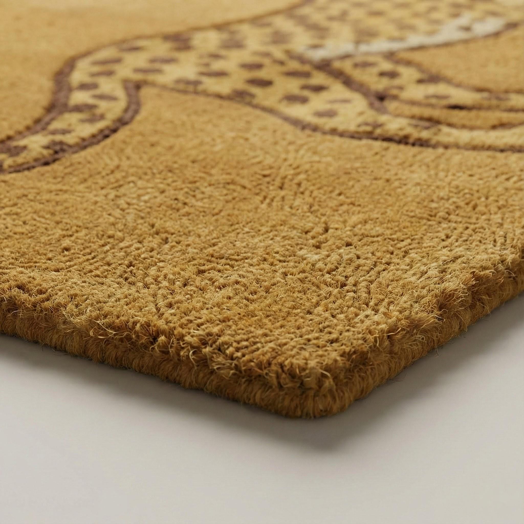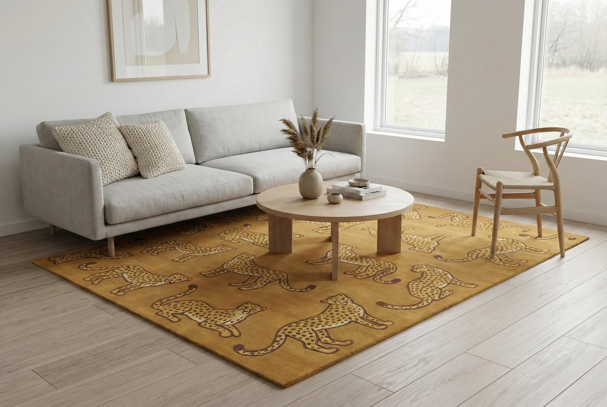 Bring bold character and luxury style into your home with this hand-tufted leopard print rug, inspired by modern safari and contemporary interior design. Featuring repeating cheetah/leopard motifs on a rich mustard ochre base, this rug makes a powerful statement while still feeling warm, artistic, and refined.
