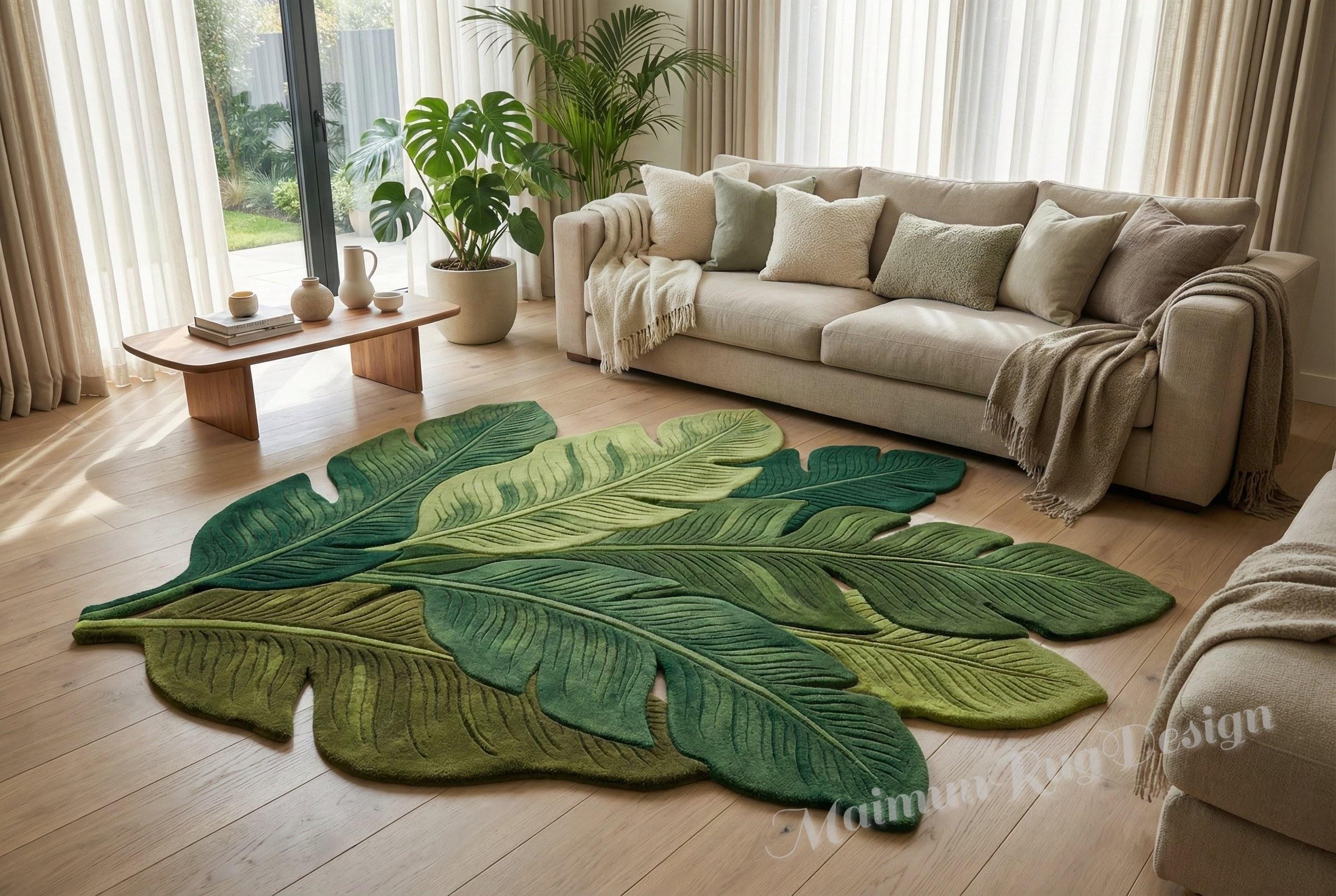 Perfect as a hero rug in living rooms, bedrooms, lounges, studios, or modern homes, this leaf-shaped rug pairs beautifully with neutral furniture, wood accents, and indoor plants. Whether styled in a contemporary, tropical, organic, or minimalist interior, it instantly elevates the space.