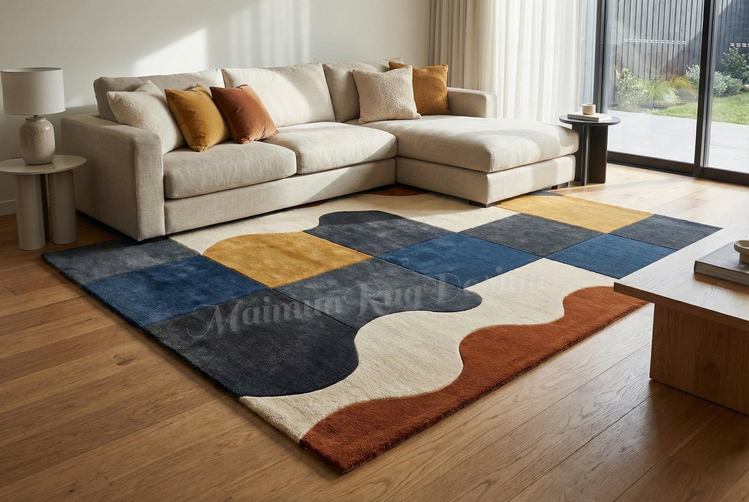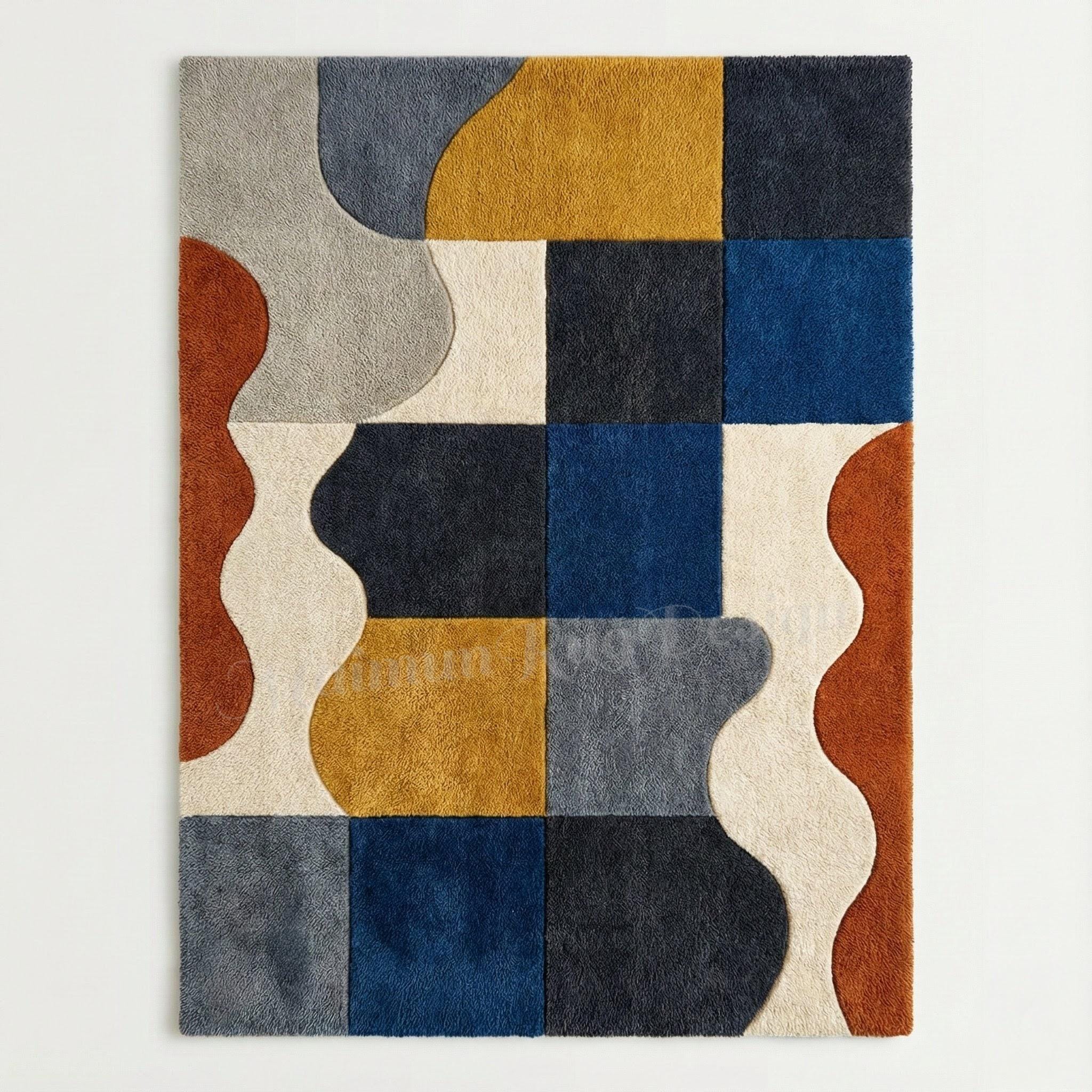 Bring refined modern artistry into your home with this hand-tufted abstract color block rug, designed with a harmonious mix of soft geometric blocks and flowing organic wave shapes. Inspired by mid-century modern and contemporary interiors, this rug is crafted to feel both bold and calming—making it a true statement piece for modern homes.