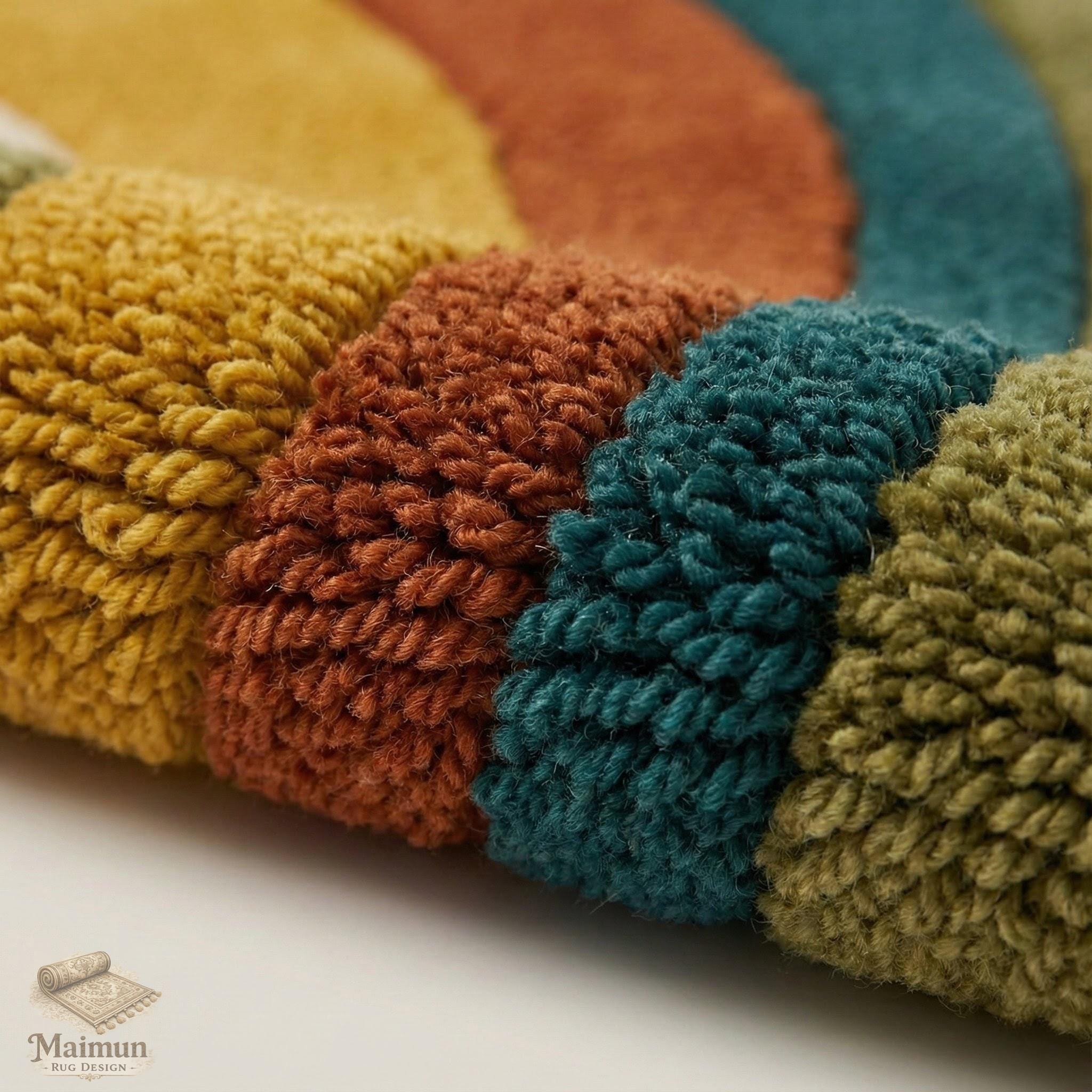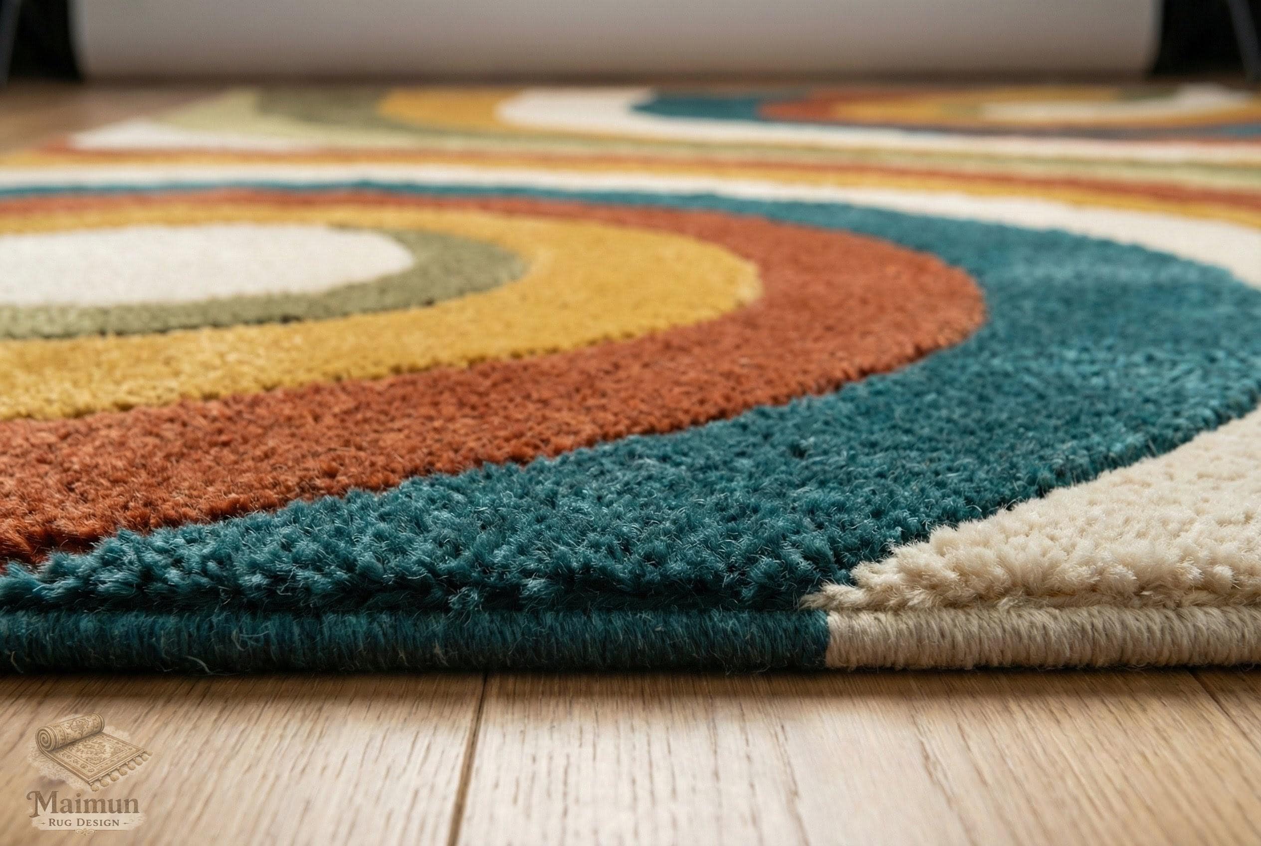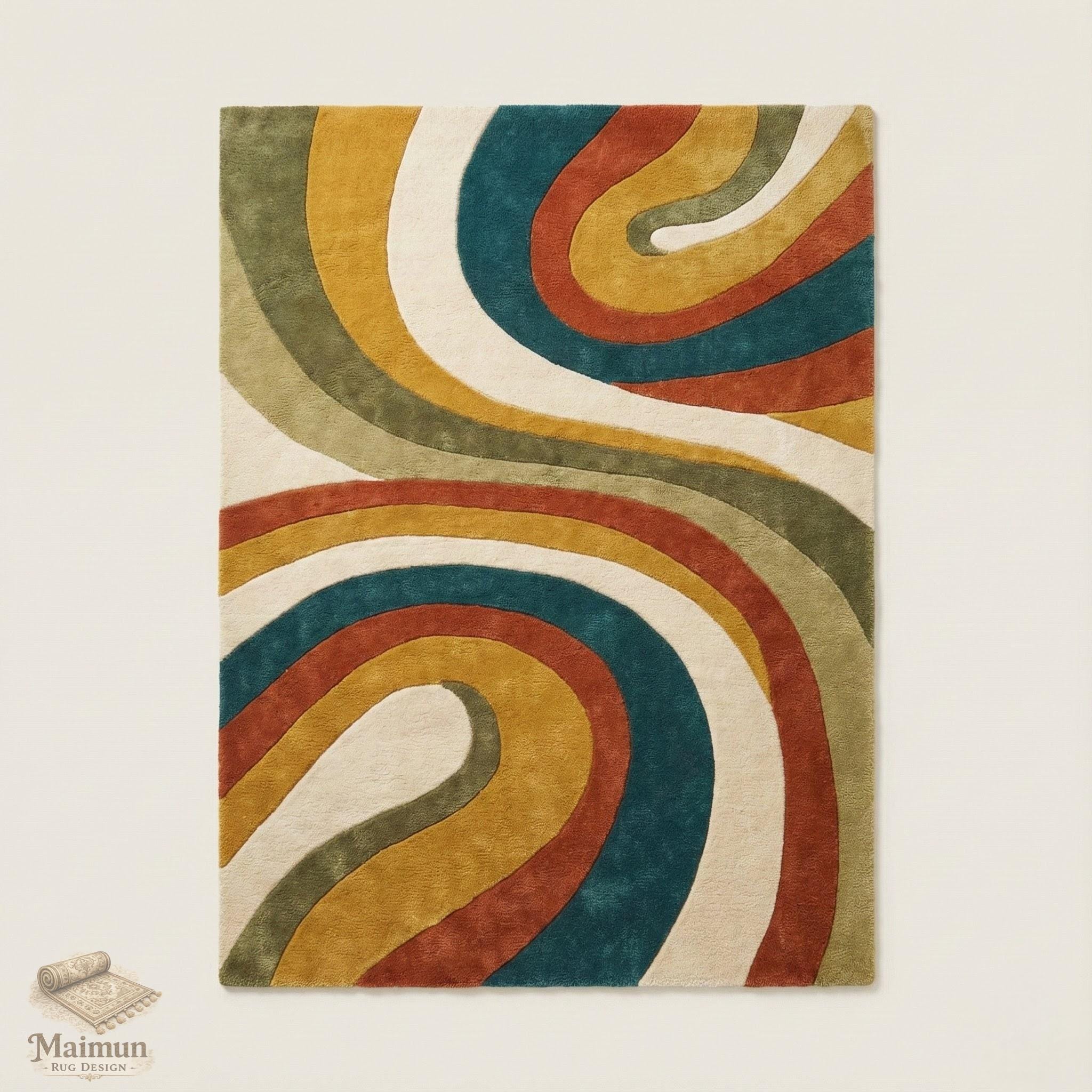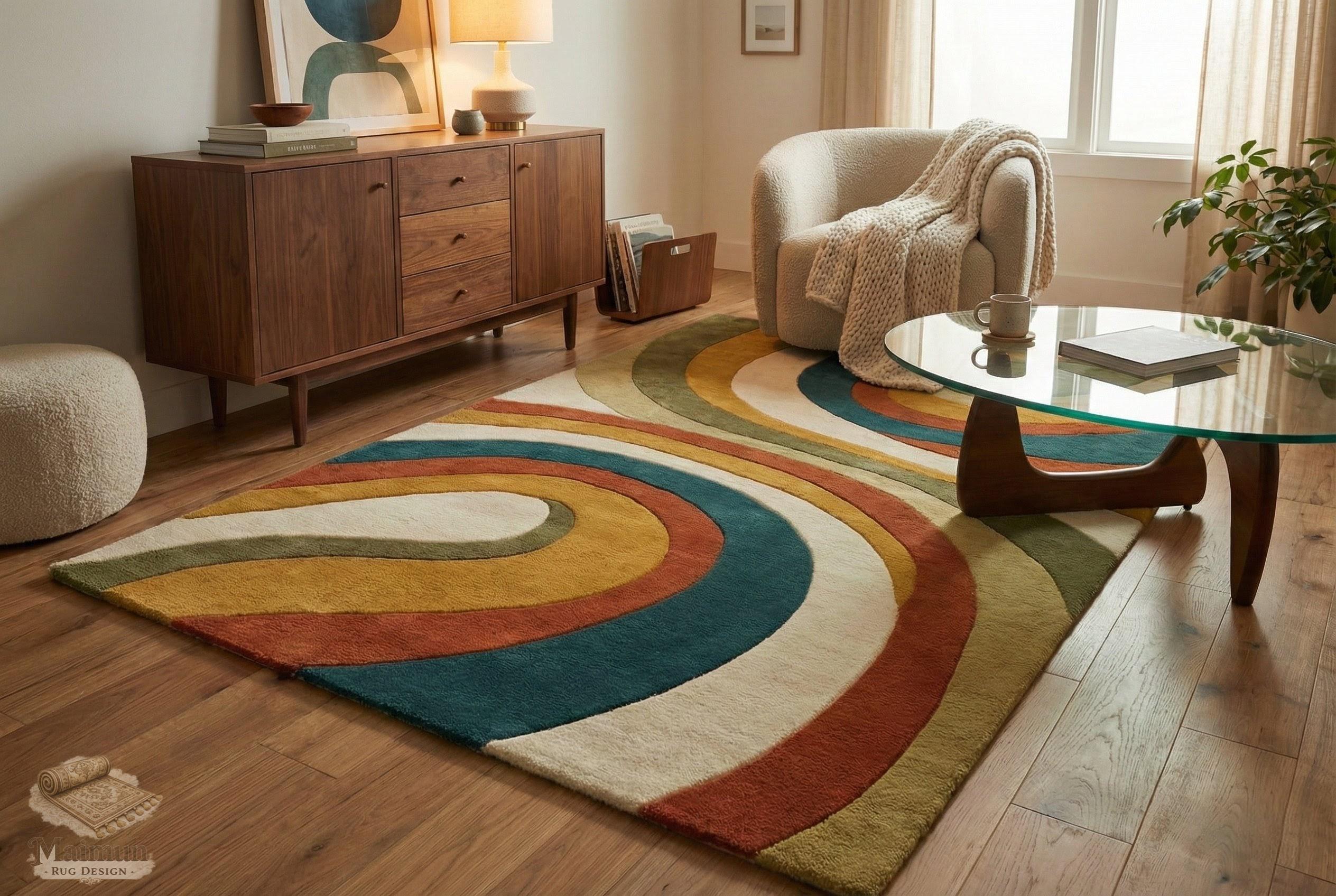 Inspired by classic mid-century modern design, the smooth curved bands create a balanced, artistic look that feels both cozy and statement-making. This rug is perfect for those who love retro aesthetics, modern interiors, and expressive home décor.