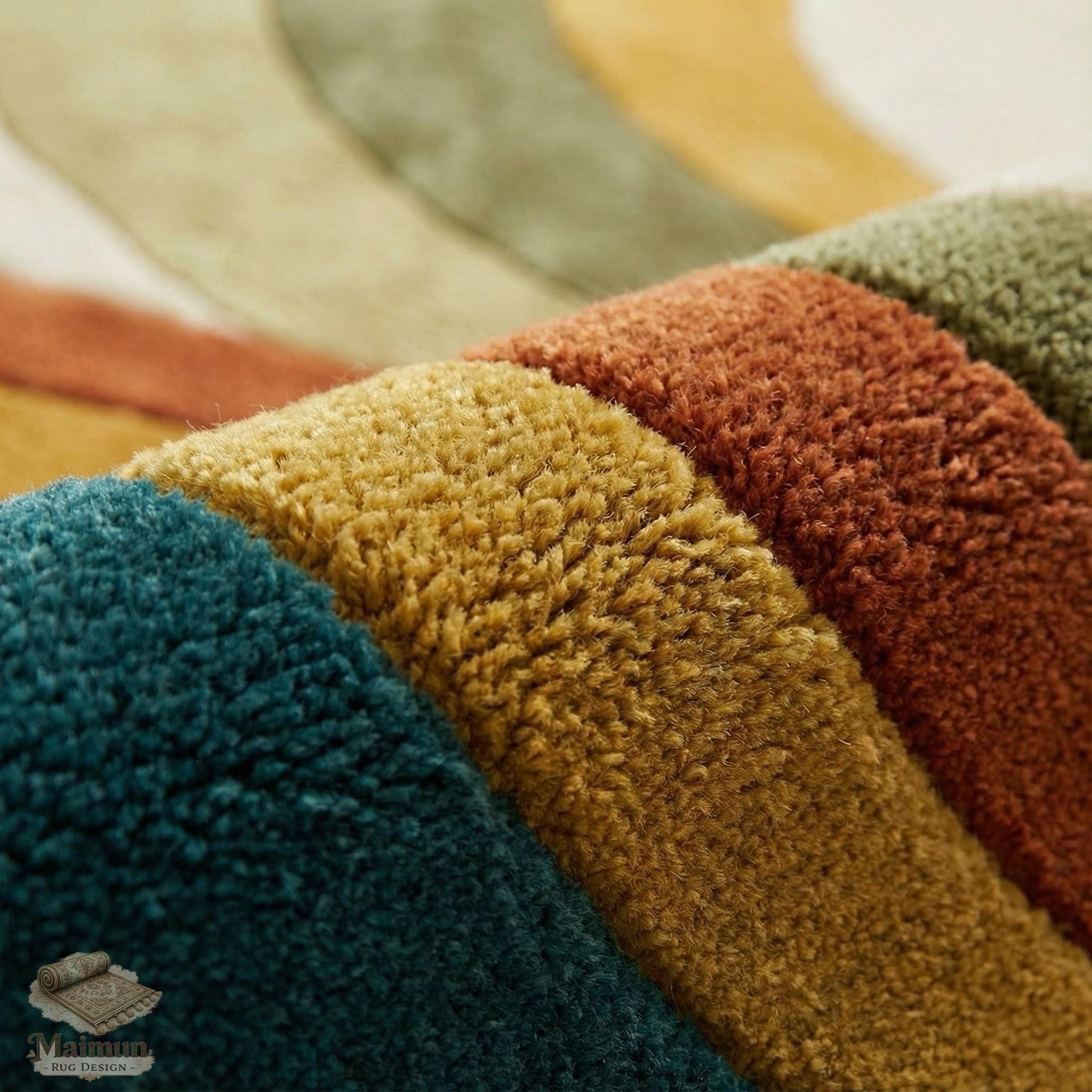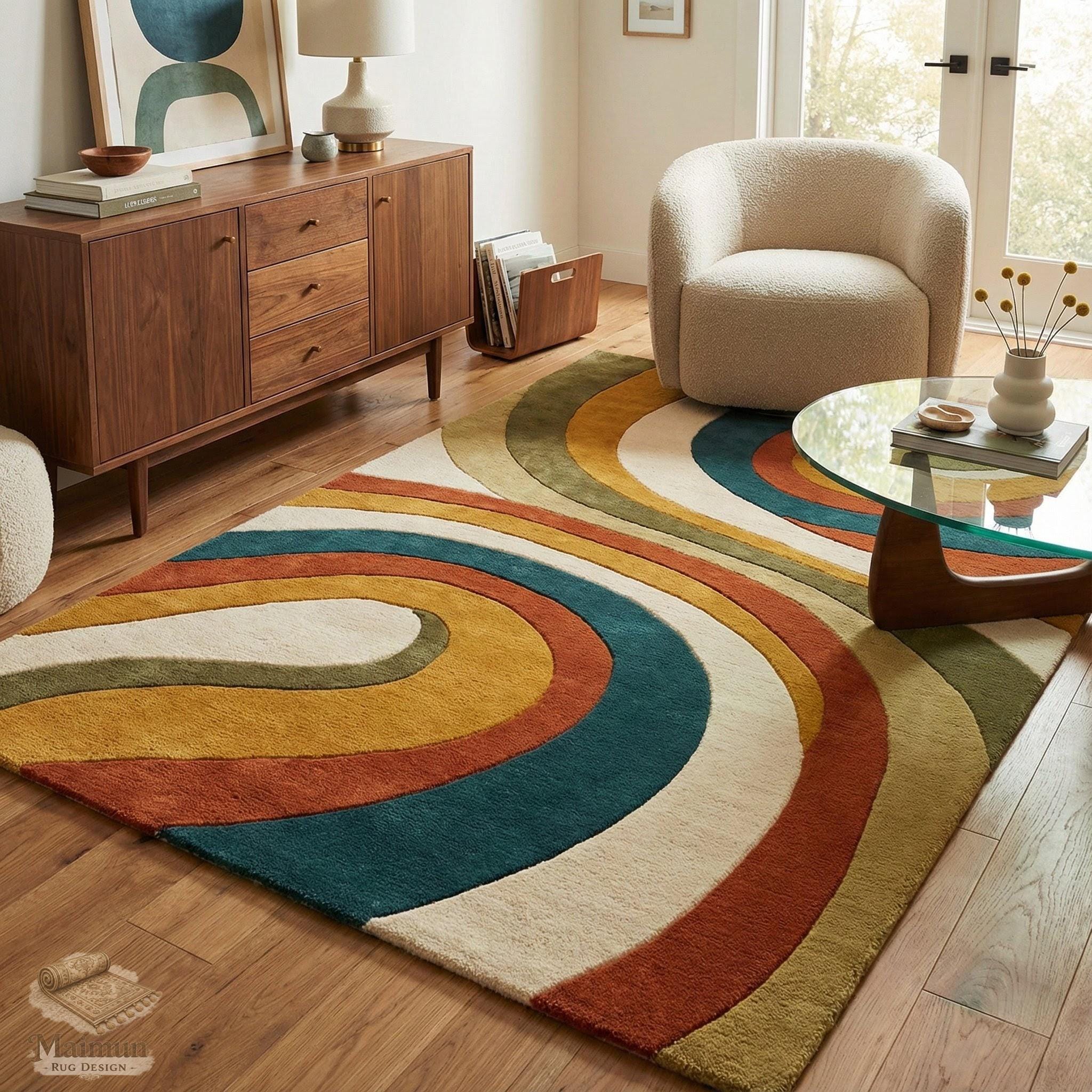 Retro Curved Wave Rug – Mid-Century Modern Hand-Tufted Wool Area Rug for Living Room Decor