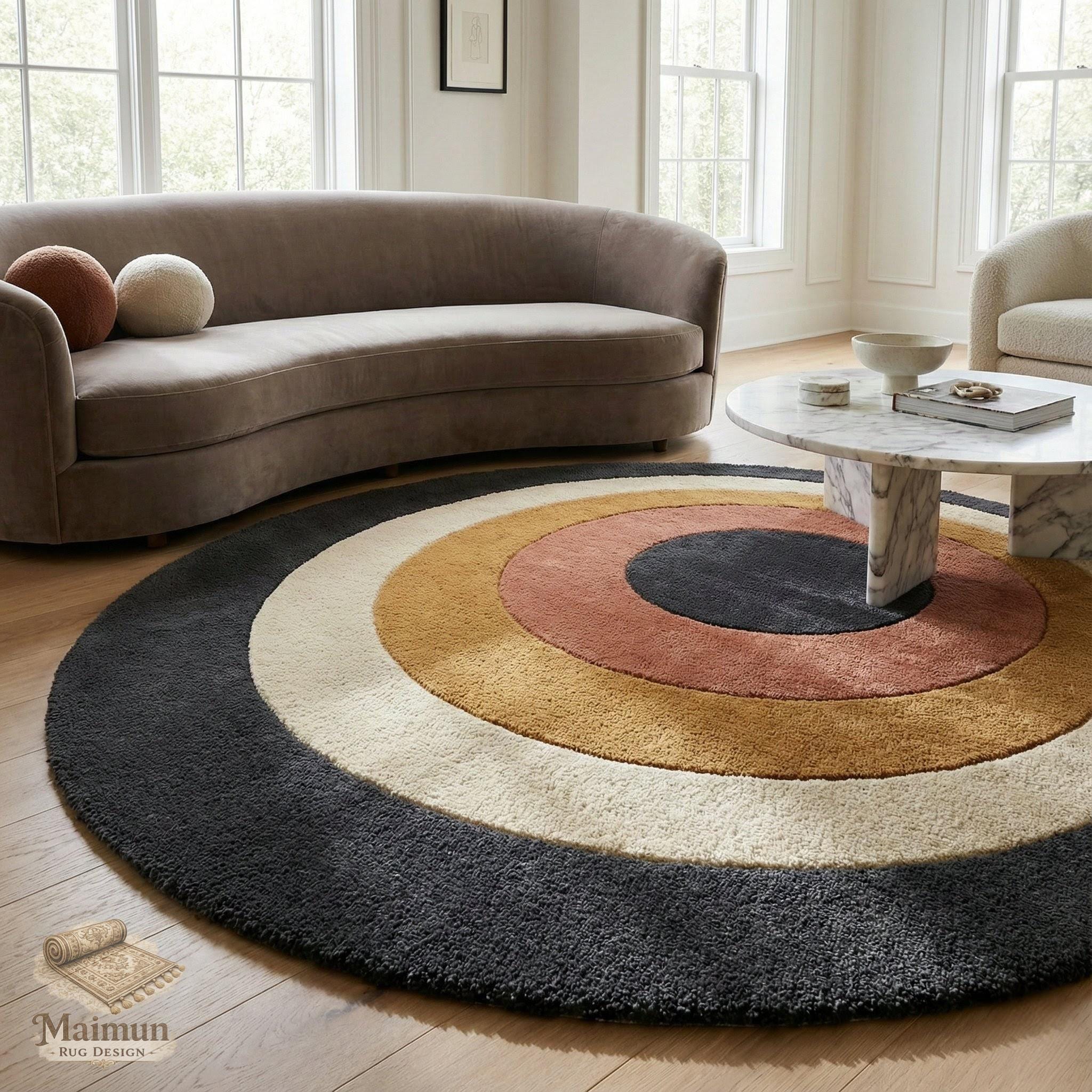 Bring calm sophistication and modern balance to your space with this hand-tufted round geometric rug, featuring a timeless concentric circle design in warm, earthy neutral tones. Inspired by Japandi minimalism and mid-century modern aesthetics, this rug adds subtle character without overpowering your interior.