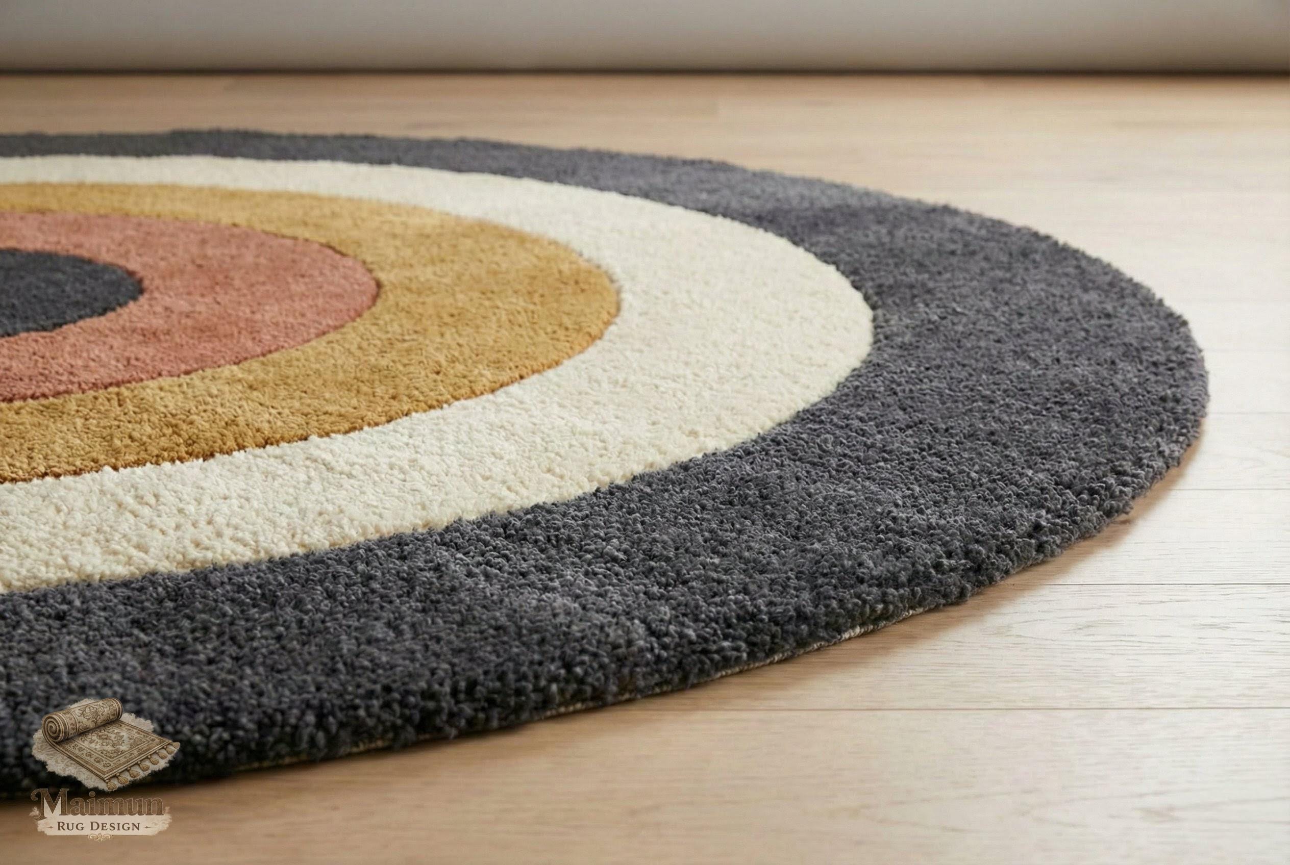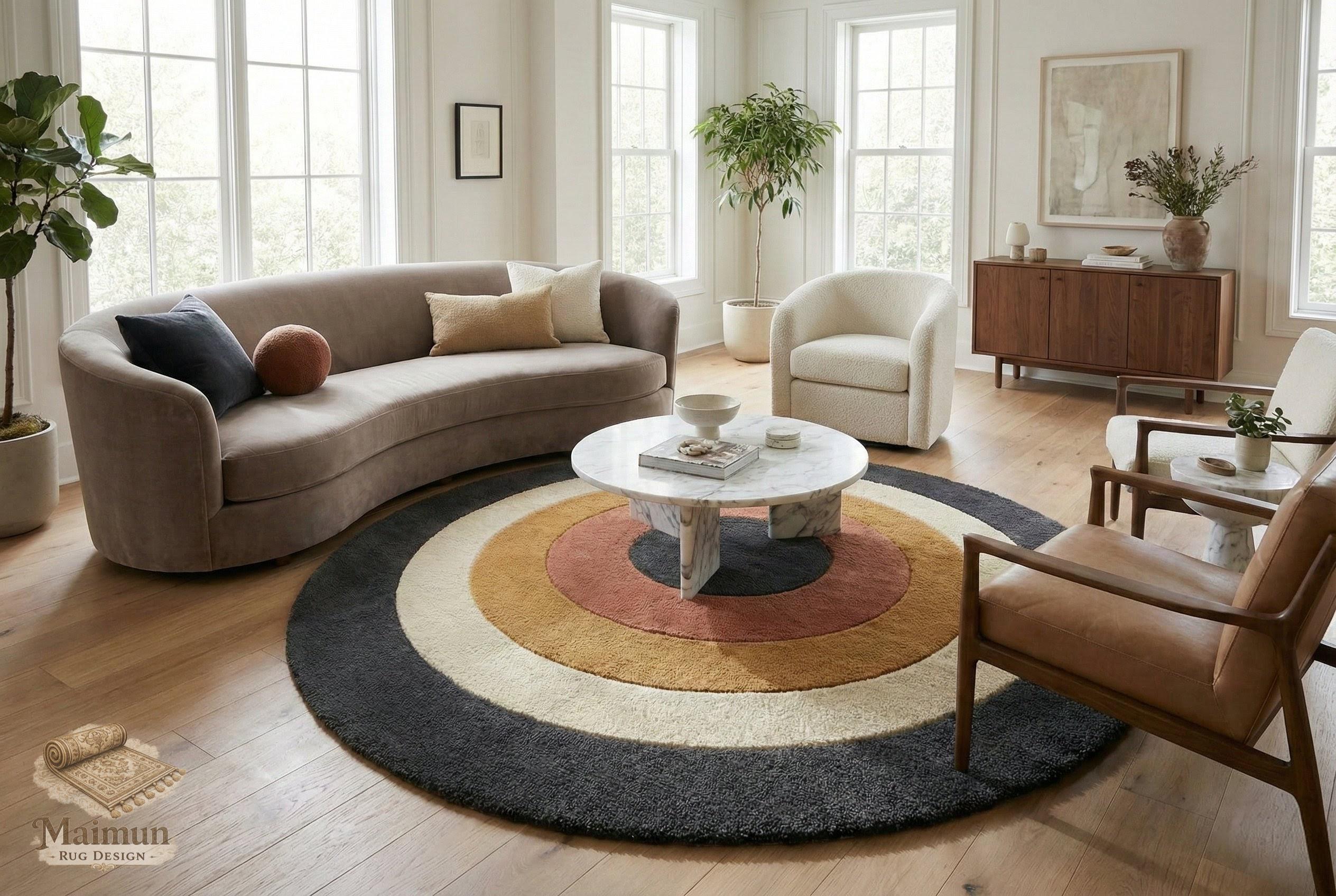The harmonious blend of charcoal grey, soft ivory, warm beige, muted mustard, and terracotta brown creates a soothing, grounded palette that pairs beautifully with neutral sofas, wooden flooring, and contemporary living spaces. Its circular pattern naturally draws the eye, making it a perfect centerpiece for your living room, bedroom, or lounge area.