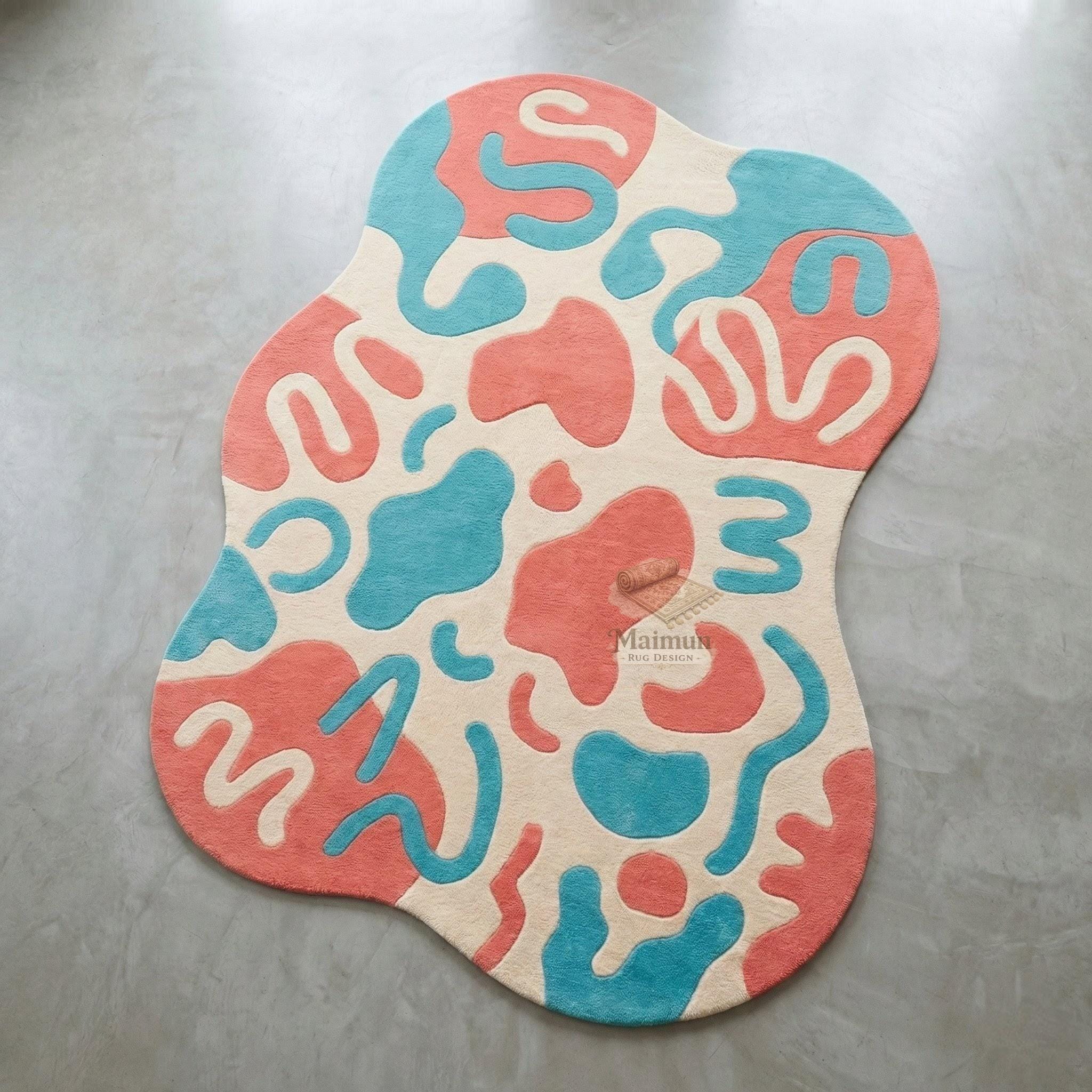 The dynamic combination of coral pink, teal blue, warm cream, and soft beige creates a lively yet harmonious look. Its flowing abstract pattern pairs beautifully with modern furniture, curved sofas, marble or concrete floors, and minimalist interiors.