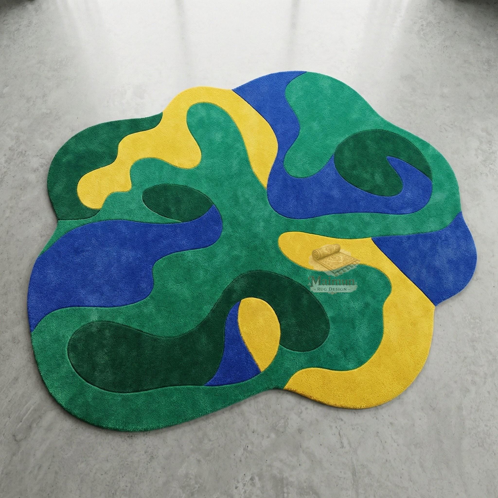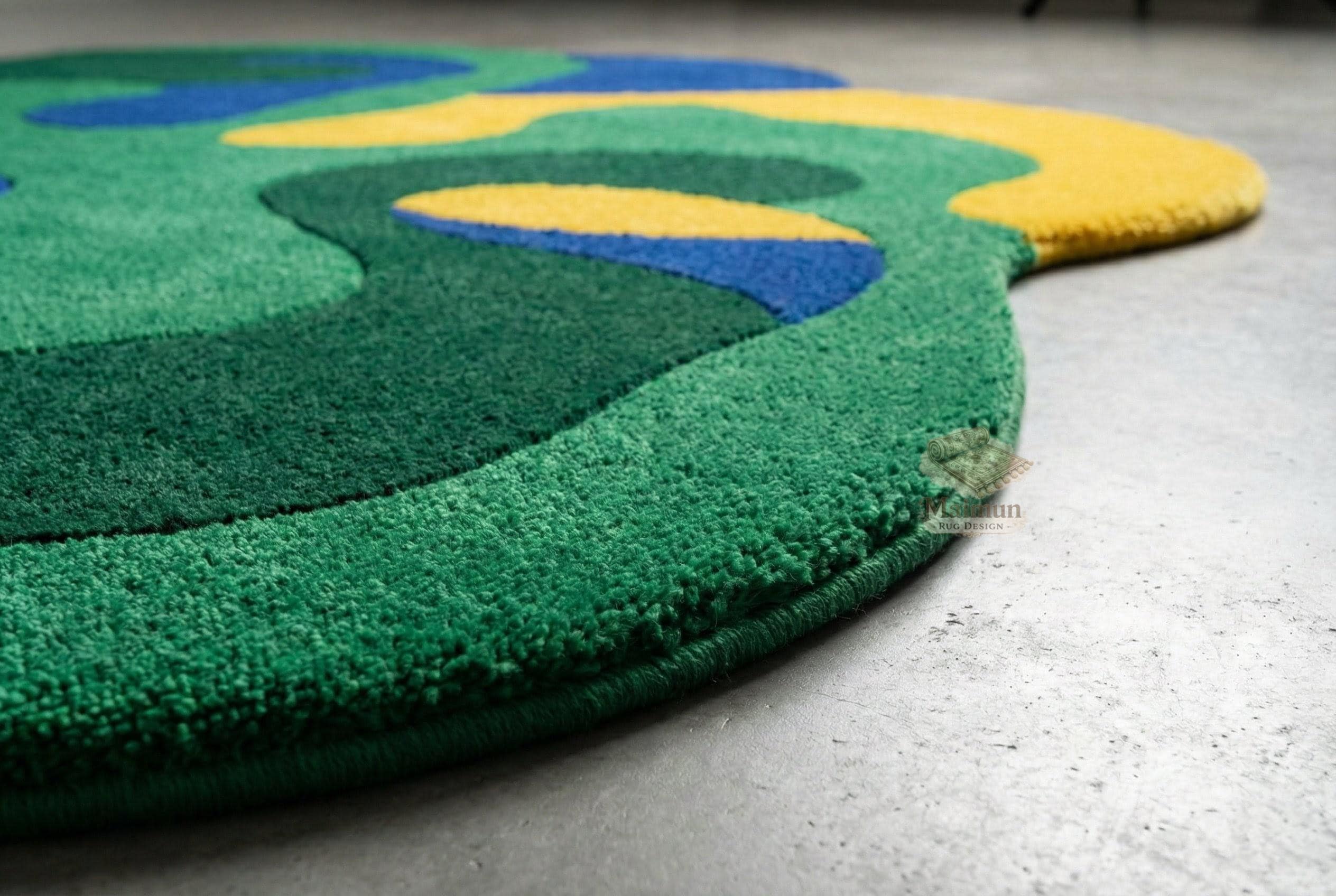 The striking blend of deep green, royal blue, vibrant yellow, and layered green tones creates a powerful yet balanced visual impact. This rug pairs beautifully with neutral furniture, curved sofas, marble or concrete floors, and minimalist modern interiors.