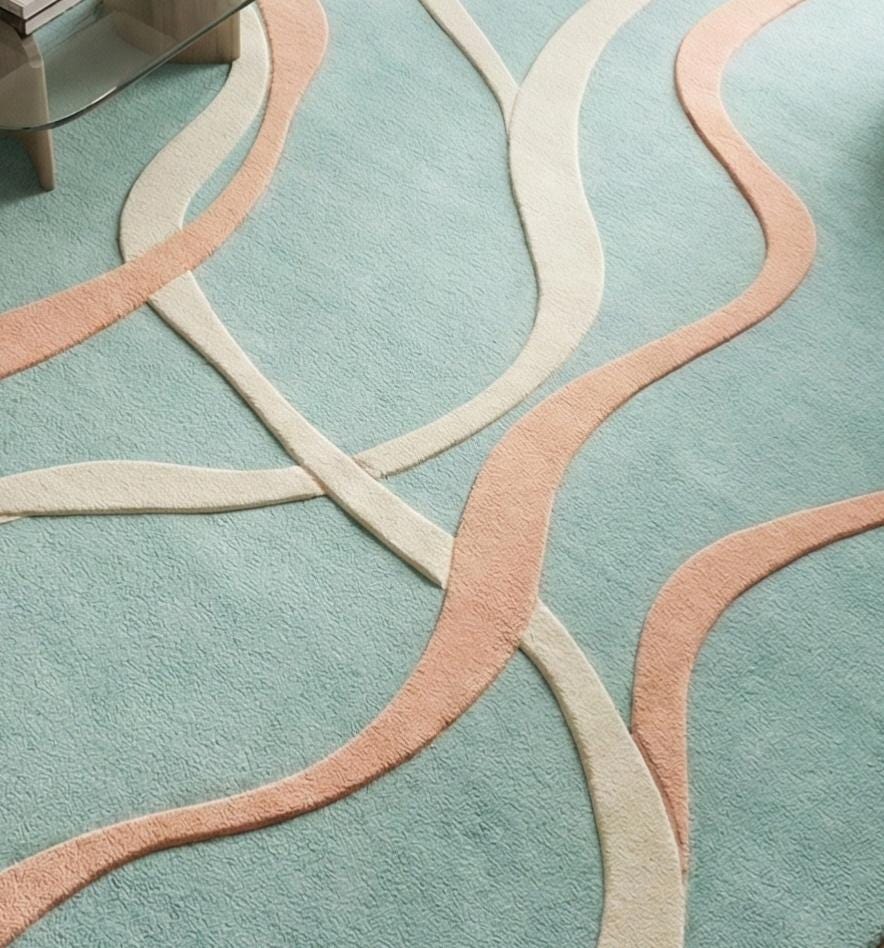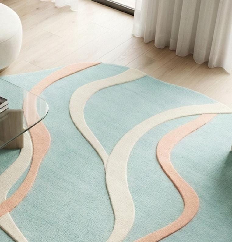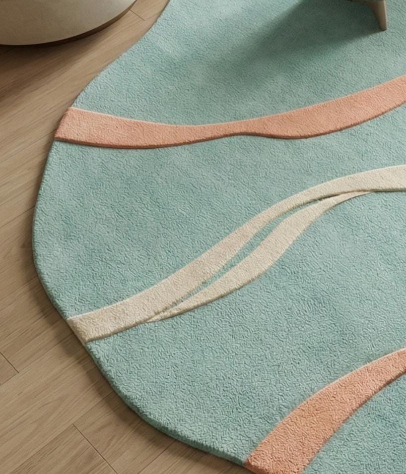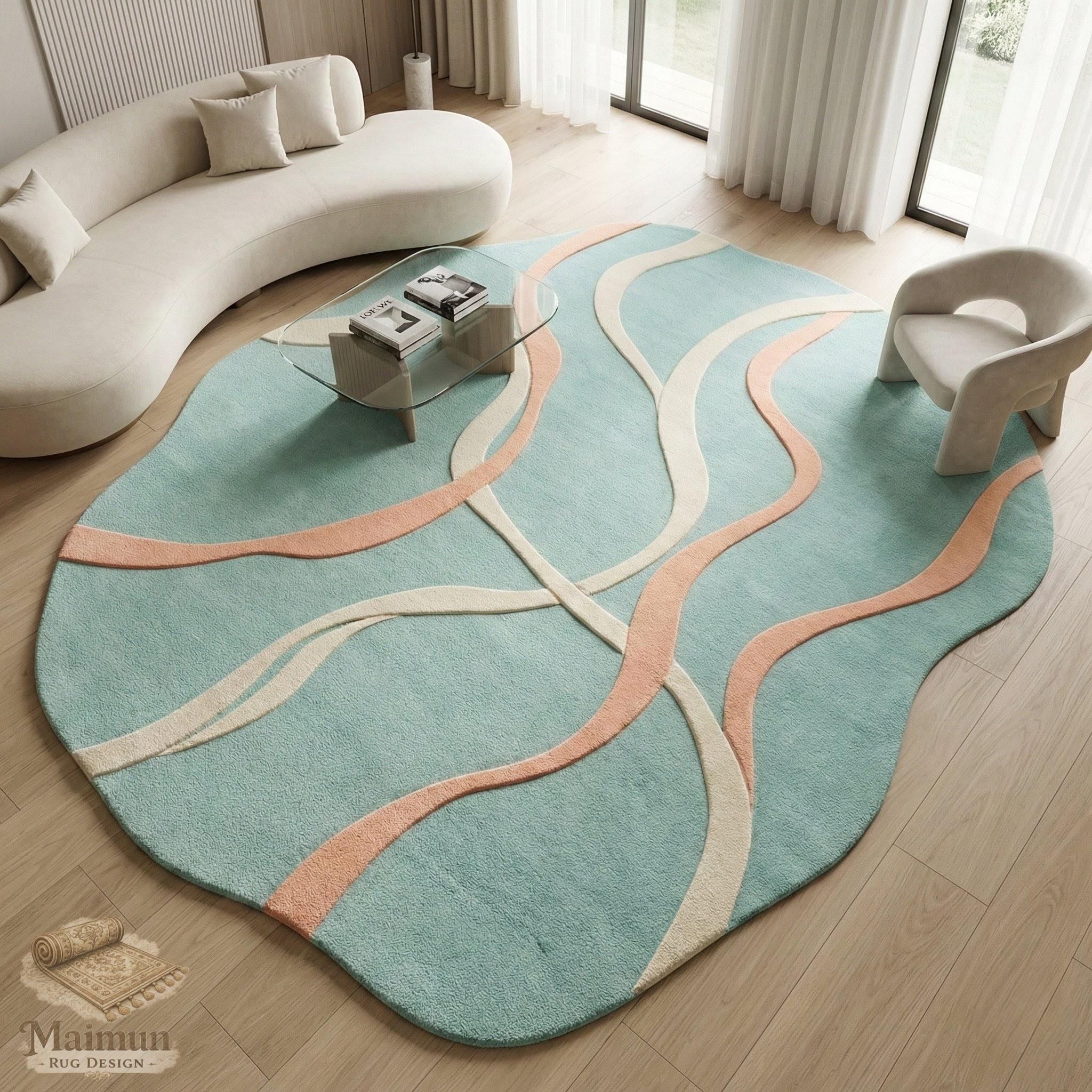 The gentle palette of soft aqua, warm cream, and muted peach blends beautifully with light wood floors, curved sofas, glass tables, and minimalist décor. Its sculptural wave design adds movement and depth while keeping the space calm and uncluttered.