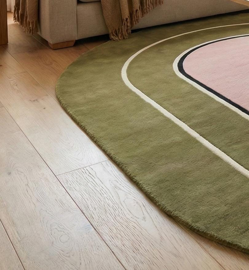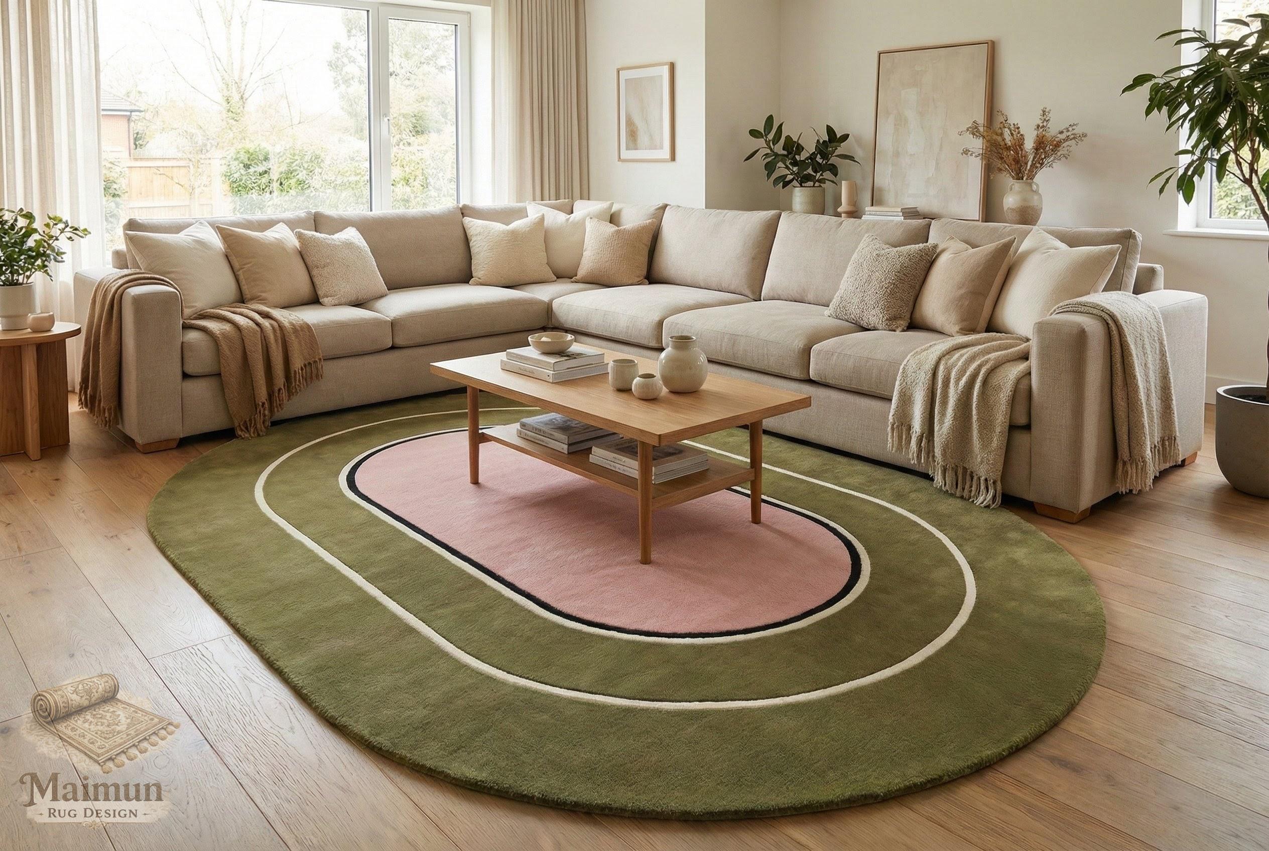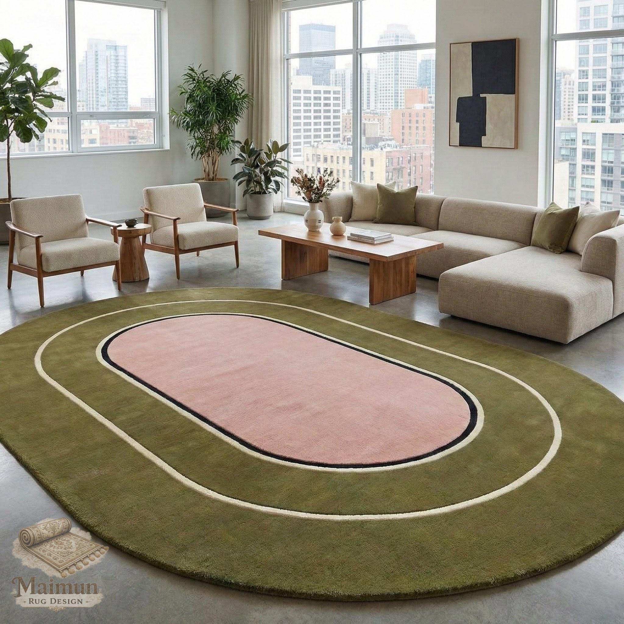This oval color block wool rug is hand tufted using premium quality wool, designed to bring balance, warmth, and modern elegance to contemporary interiors. Featuring a framed oval center with smooth concentric layers, this rug creates a calm yet distinctive focal point for stylish living spaces.