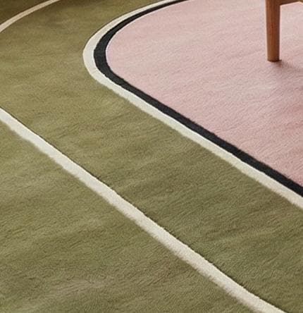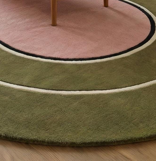 The refined palette of earthy olive green, soft blush pink, warm cream, and subtle black outlining offers a sophisticated, design-forward look. This rug pairs beautifully with wooden furniture, neutral sofas, indoor plants, and minimal modern interiors.