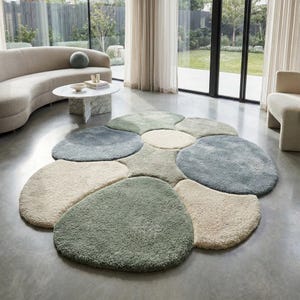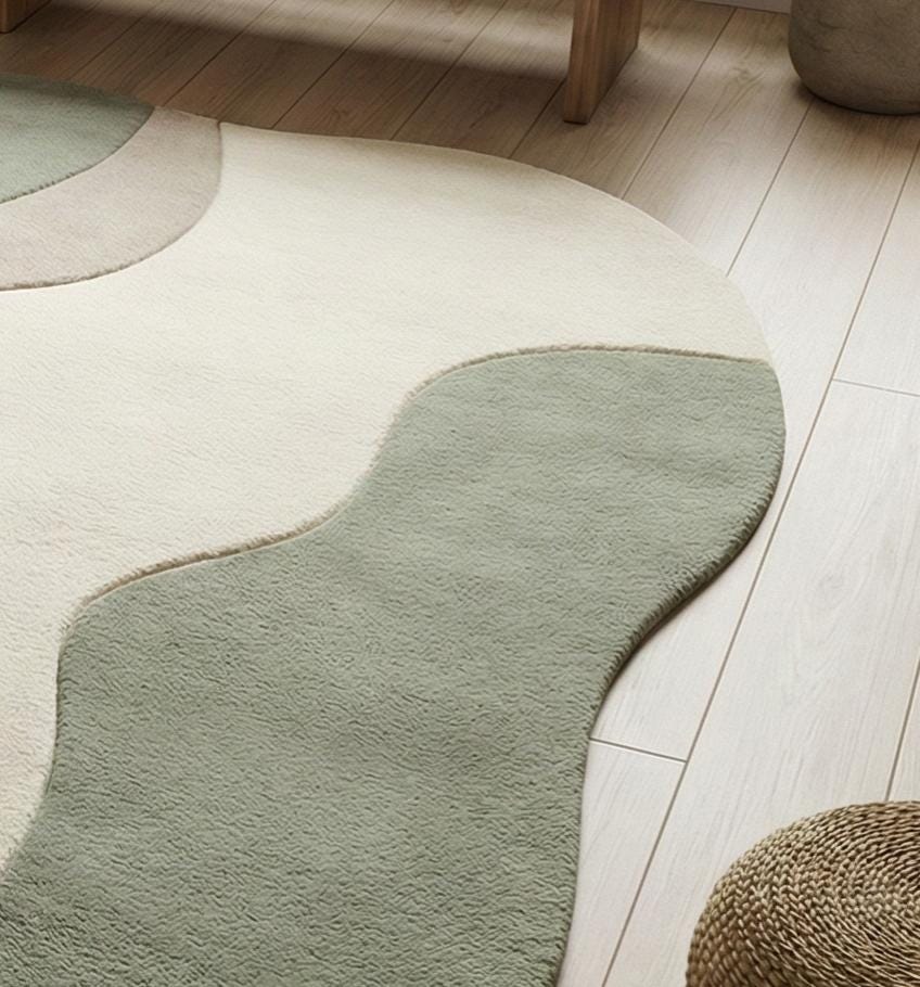 This organic sage green rug is hand tufted using premium quality wool, inspired by soft flowing forms and Japandi minimal design. Its irregular shape and gentle wave pattern bring a calm, natural rhythm to modern interiors, creating a soothing and balanced living space.