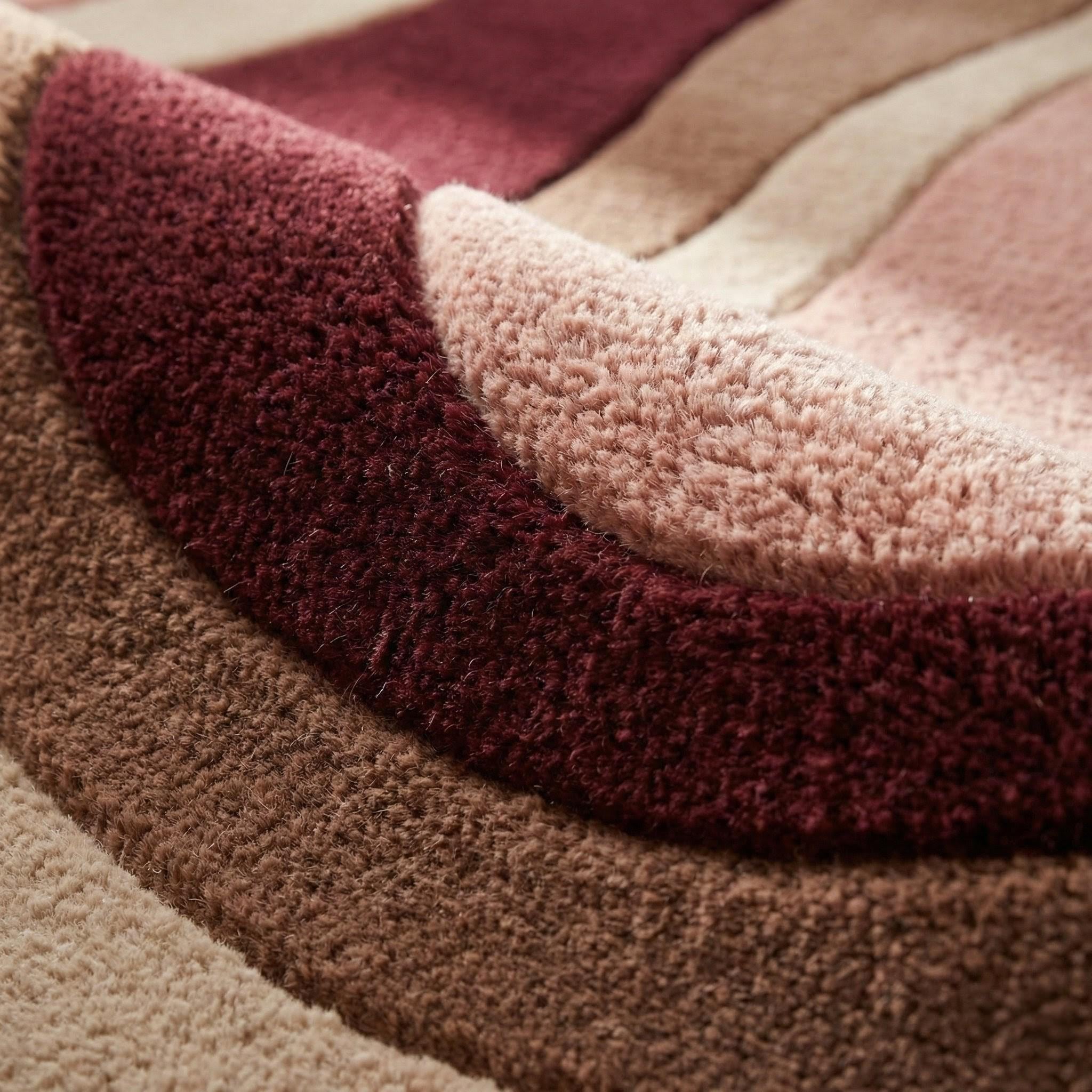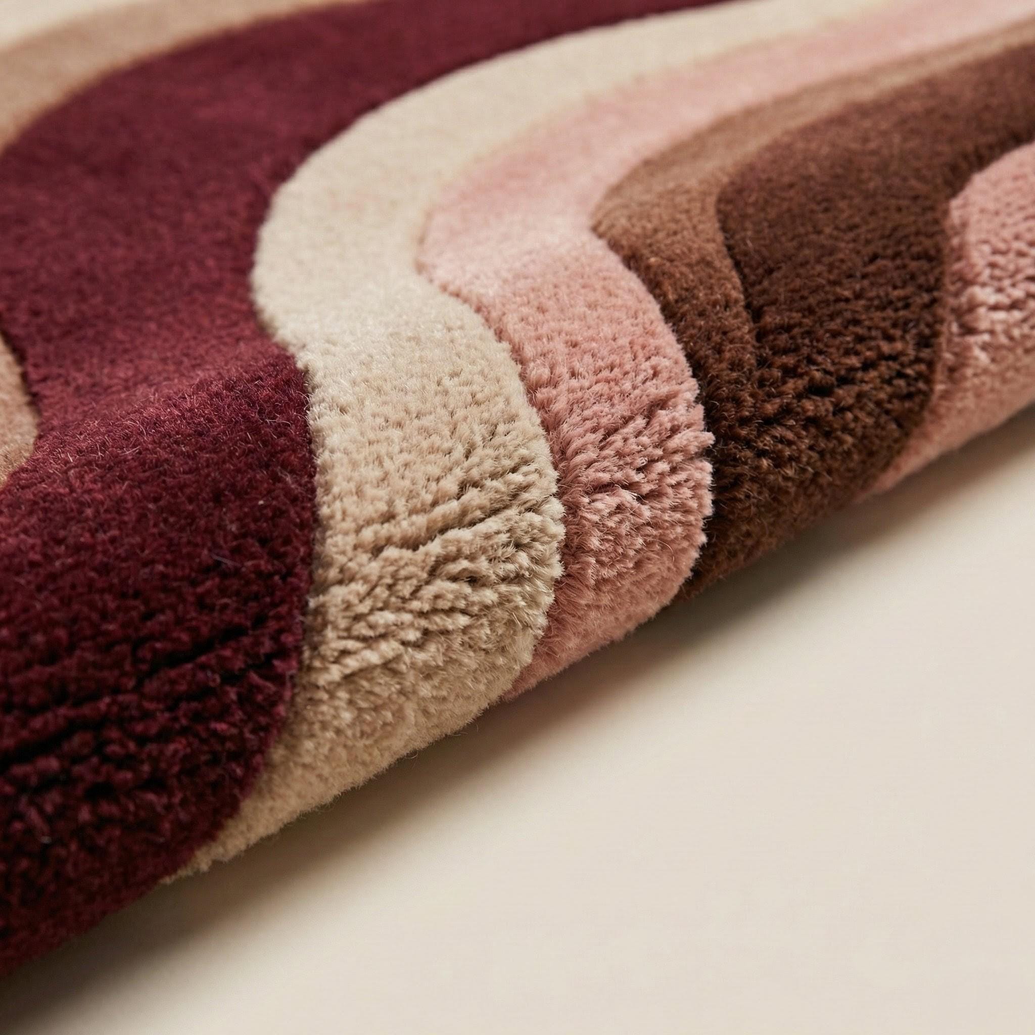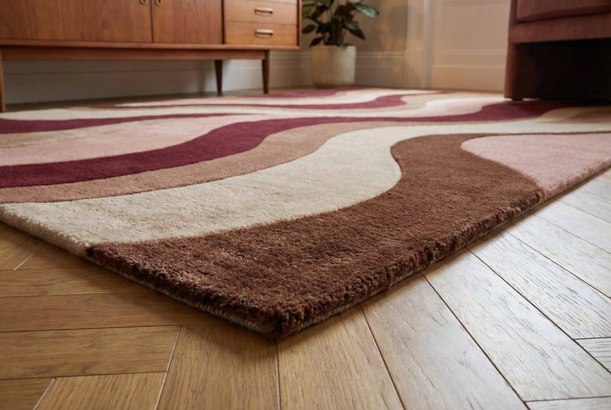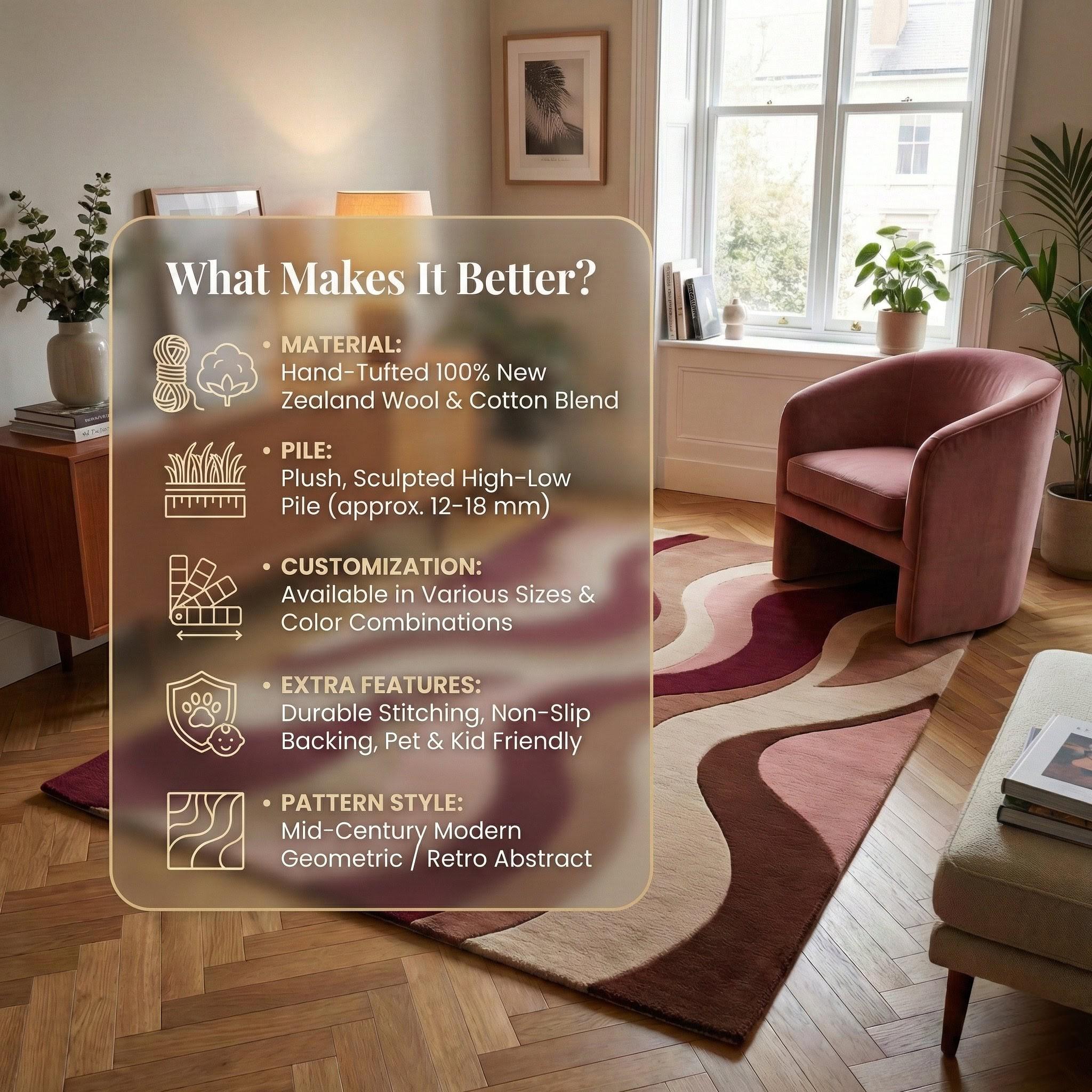 This mid century modern rug is hand tufted using premium quality wool, inspired by retro wave movement and warm vintage tones. The flowing abstract pattern features burgundy, blush pink, mocha brown, and soft beige, creating a cozy yet sophisticated statement for modern interiors.