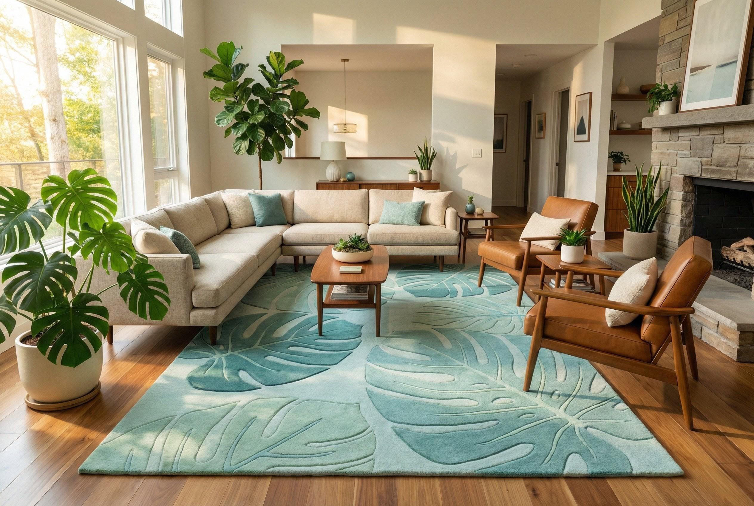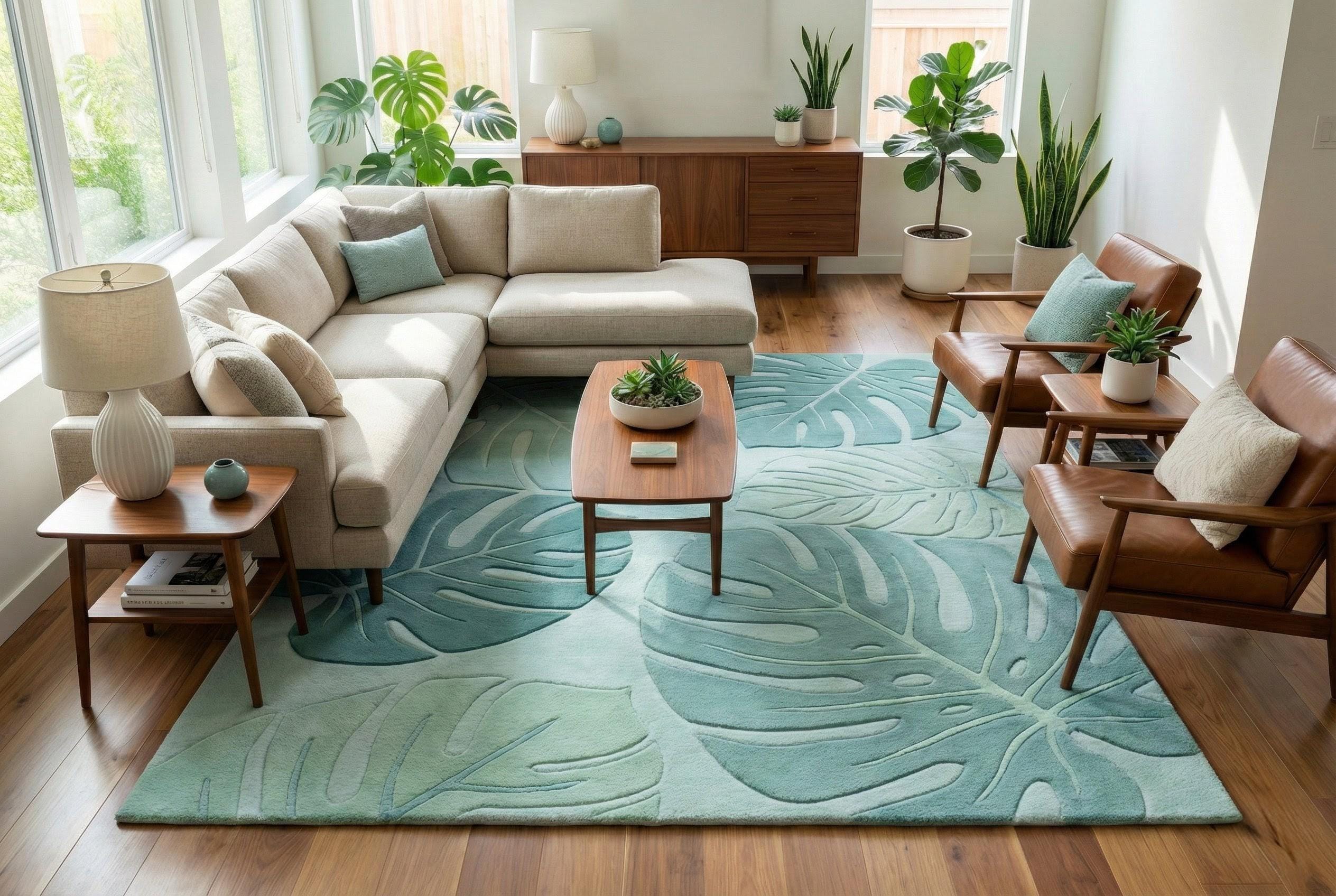 This botanical monstera leaf wool rug brings a fresh, tropical, and calming vibe to modern interiors. Inspired by lush greenery and nature-led design, the layered leaf pattern adds depth, softness, and a soothing organic feel to your space.