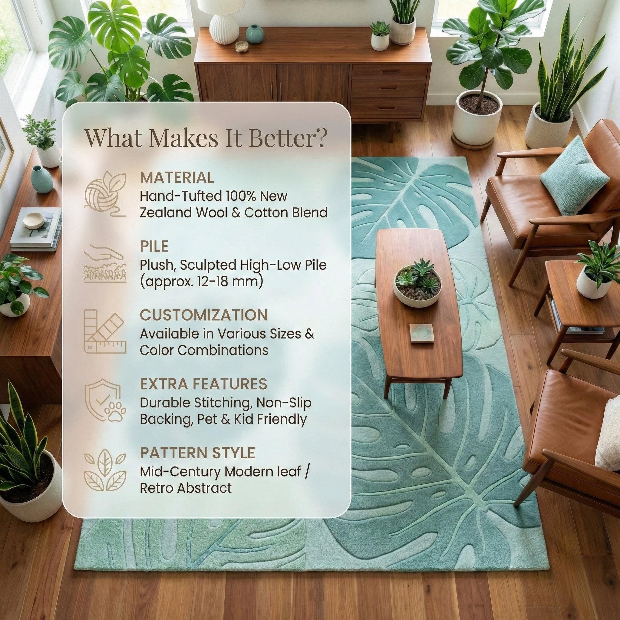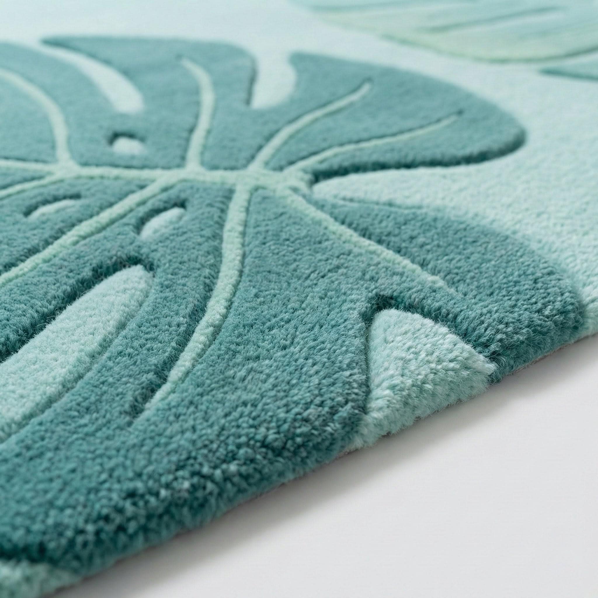 ✔ Material: 100% Premium Wool ✔ Technique: Hand Tufted ✔ Pile Height: Medium plush – soft, dense & durable ✔ Design: Botanical Monstera Leaf Pattern ✔ Colors: Mint Green, Sage Green, Soft Teal ✔ Shape: Rectangle ✔ Style: Botanical, Tropical, Modern, Scandinavian ✔ Use: Living room, bedroom, lounge, sunroom ✔ Origin: Handmade in Bhadohi, India